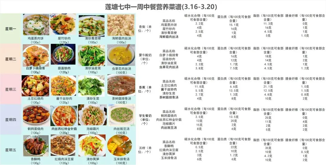 您好!孩子在校的每一餐,都牵动着我们的心。我们坚持食材严选、营养搭配,全力守护孩子们的健康成长。为了让您清晰了解孩子的在校饮食情况,现将下周(3.16-3.20)营养食谱公布如下。