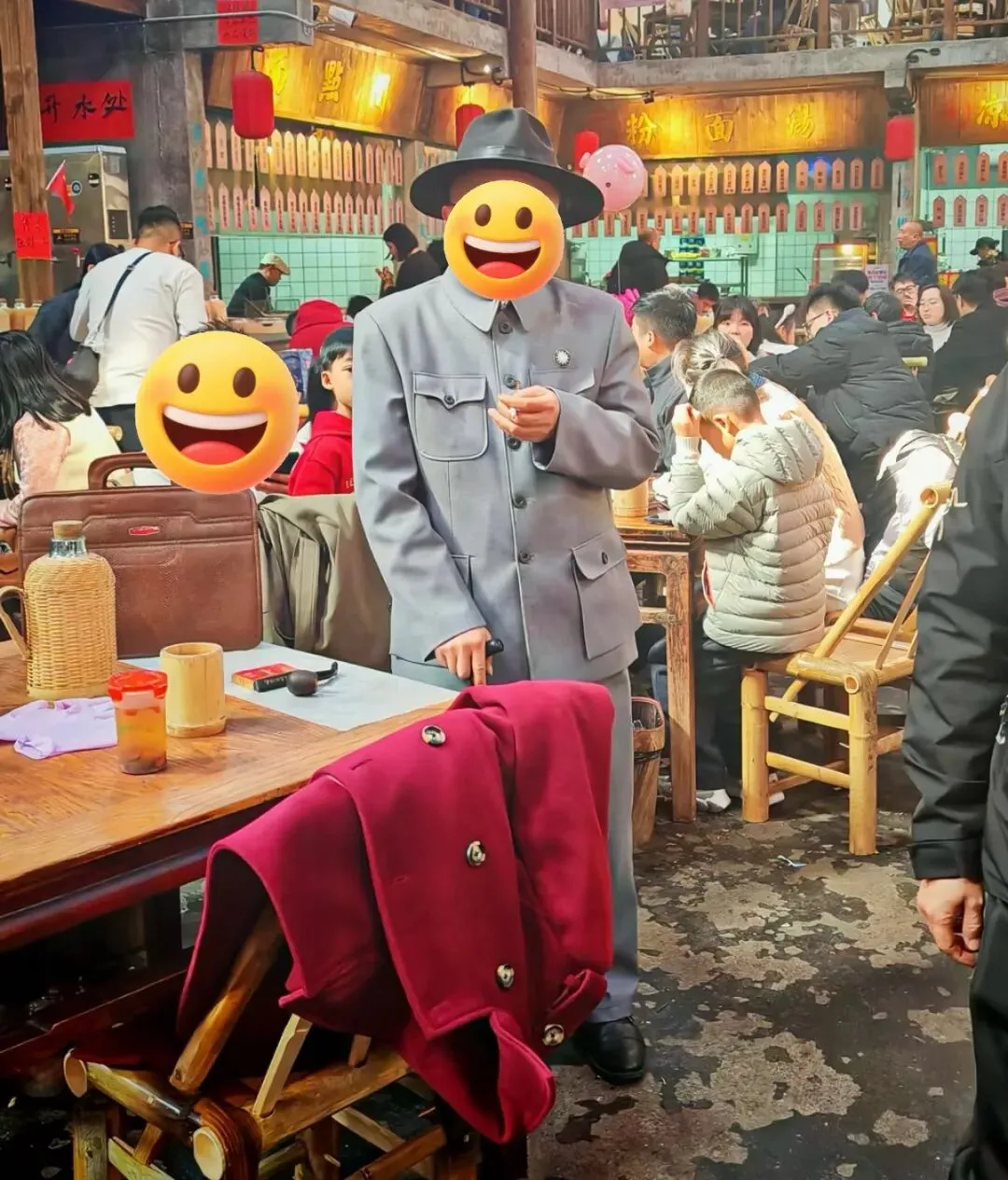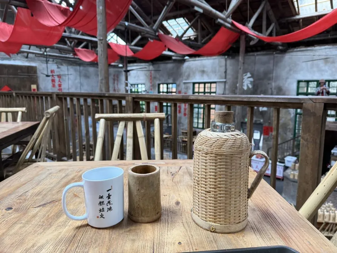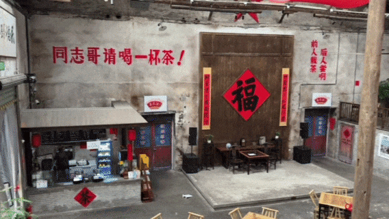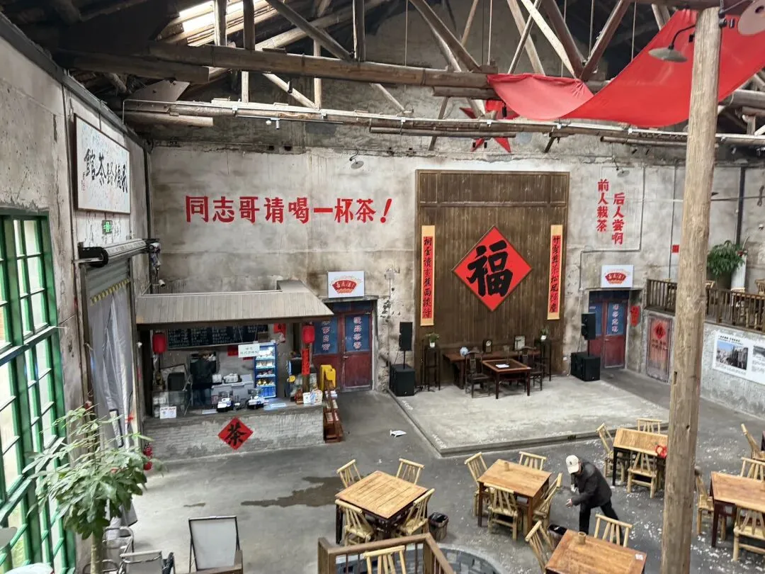 整个茶馆层高很高、很阔,天花板是“人字形”的木梁和短木片构成的,挂了很多红色的“长红”装饰,墙上写了很多很有年代感的标语,譬如:同志哥请喝一杯茶(我一直以为这是湖南话)、世上无难事只要肯攀登等等,很有穿越感。