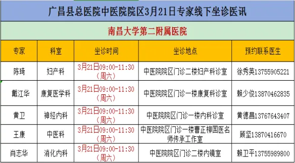 为切实推动远程诊疗工作落到实处,让广昌群众在家门口即可享有省级知名专家提供的高品质诊疗服务,我院将持续加强技术创新与对外合作,以更优质的医疗服务守护百姓健康。中医院院区特邀南昌大学第二附属医院远程诊疗线下专家团队,于3 月 21 日(星期六)上午来我院开展坐诊活动。本次远程诊疗实行线上线下同步进行,线下中医科、康复科、消化内科等科室专家将在我院每月第三周星期六上午定期坐诊。广大群众如有需求,请提前预约。
