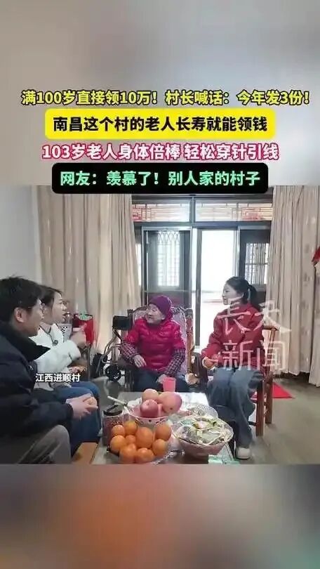 南昌一村给满百岁老人发放10万元长寿奖,已领取的老人笑称很耐用,今年村里有3位老人满100周岁