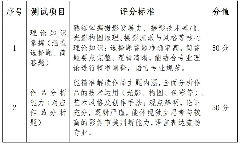 2.摄影基础(考查科目:摄影理论与作品分析),闭卷笔试,考核考生的摄影专业理论基础、影像审美能力、作品解读与分析能力,兼顾对摄影技术应用及创意表达的考查,适配专业人才培养需求。