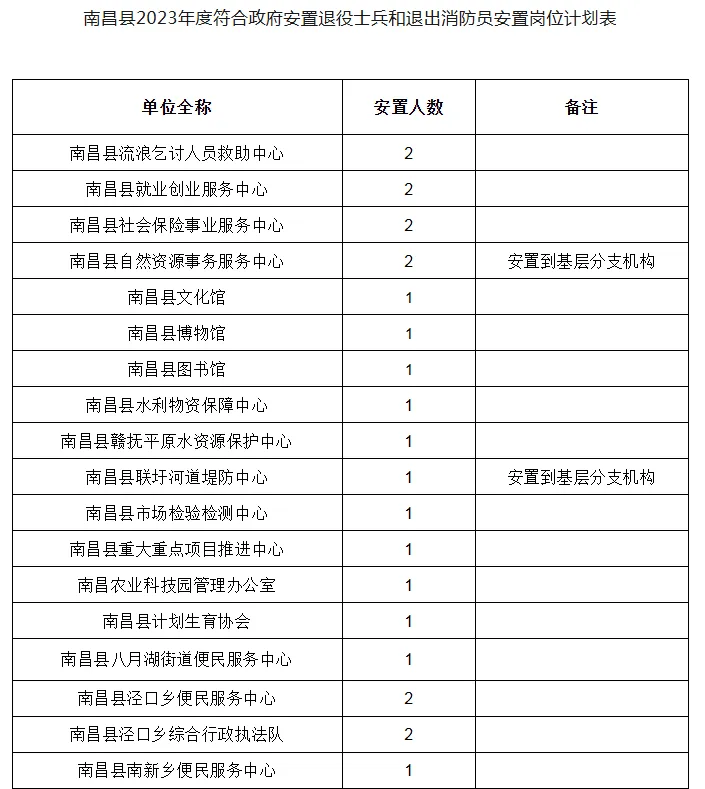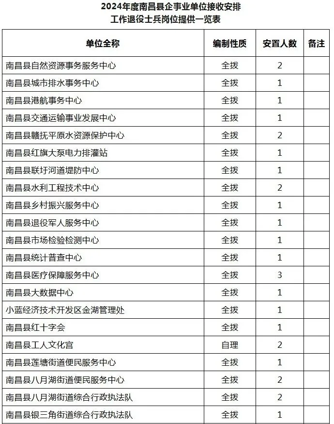 近四年南昌县退役军士安置稳定规范,每年安置 40 人左右,坚持量化评分、阳光选岗,岗位数多于安置人数,全额拨款事业单位为主体、差额拨款及县属国企为补充,安置率 100%。