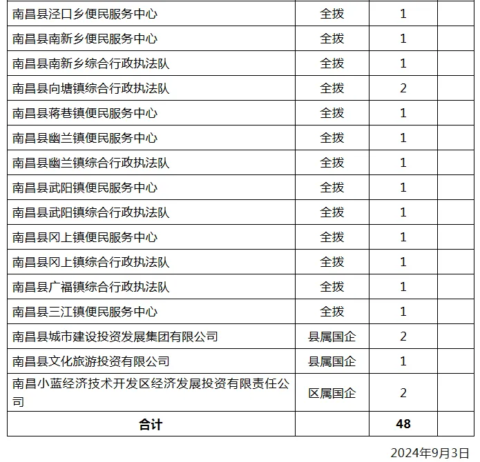 提供岗位:48 个(全额拨款事业单位41 个、事业自理2 个、县属国企5 个)。