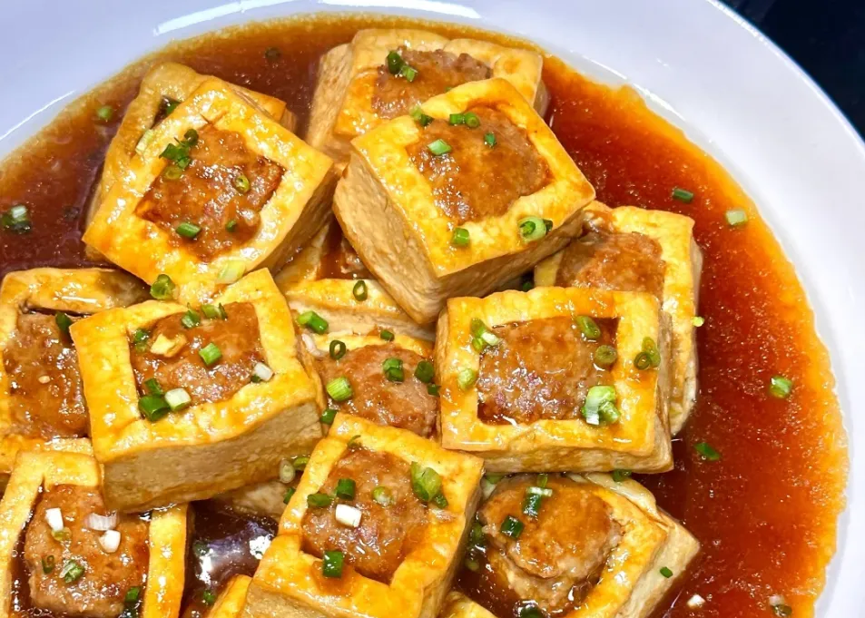 老豆腐切块挖个小洞,塞进猪肉末,肉里拌葱姜、盐、少许米酒。锅里先把豆腐两面煎到微黄,再加酱油和一点高汤,盖上焖几分钟,让豆腐把汤汁吸进去,入口先是豆香,后面是肉的鲜。
