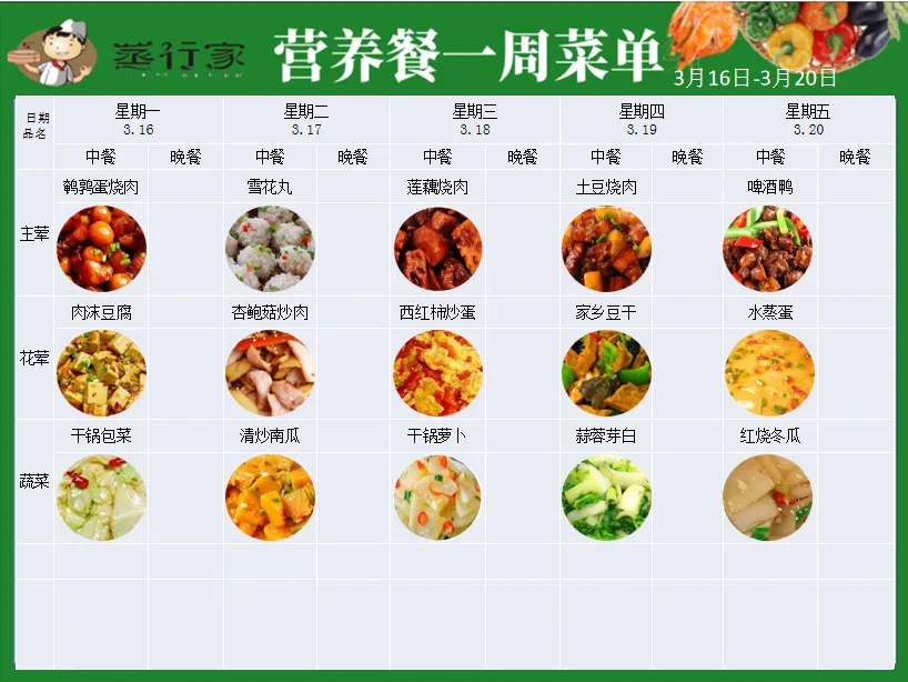 >南昌二中九龙湖校区(博雅学校)一周菜谱(3.16—3.20)