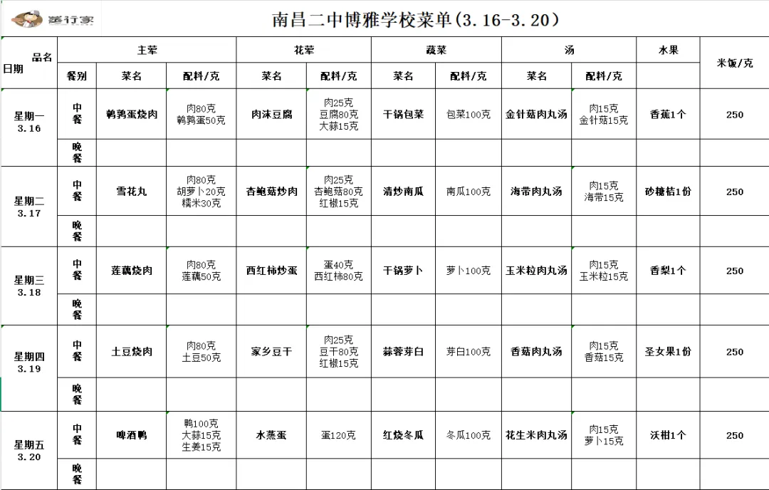 南昌二中九龙湖校区(博雅学校)一周菜谱(3.16—3.20)