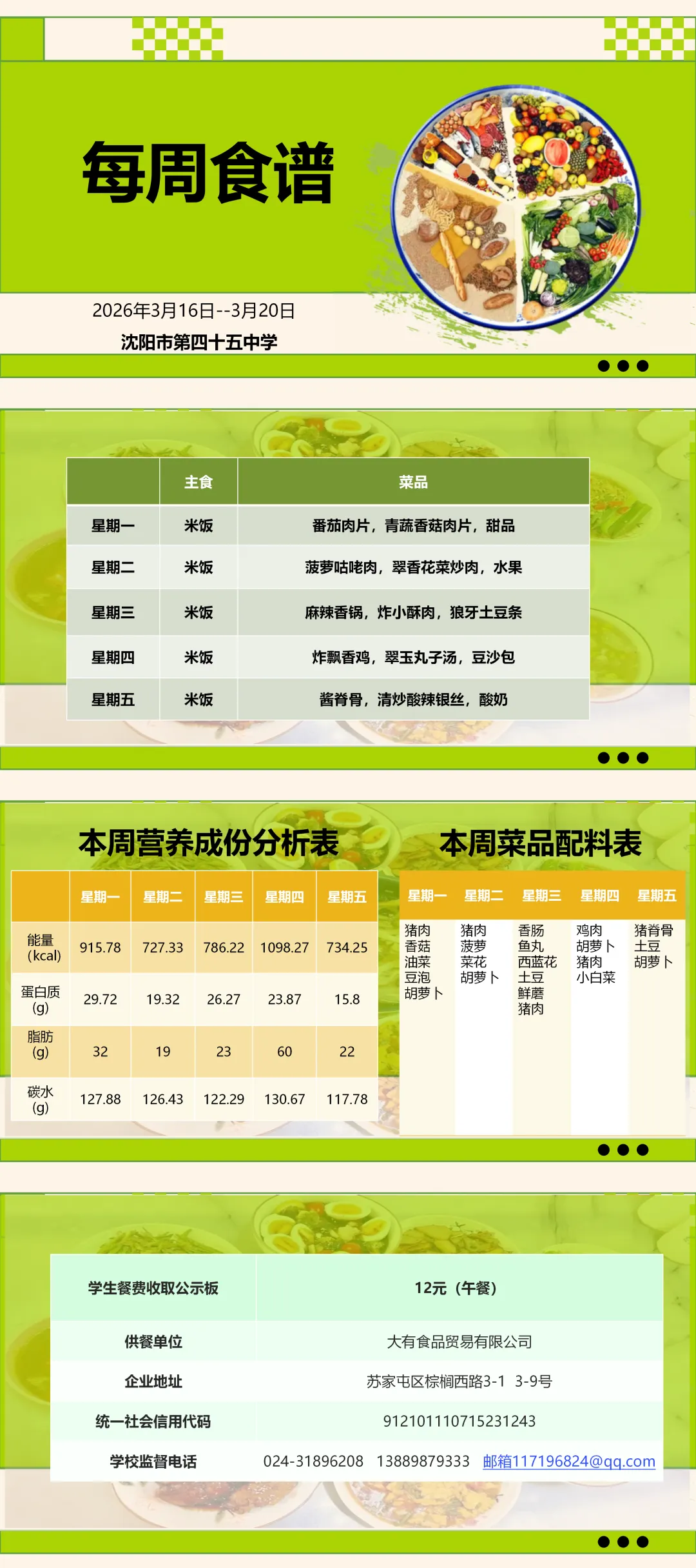 【南昌 满融】沈阳市第四十五中学2026年3月16日-3月20日食谱