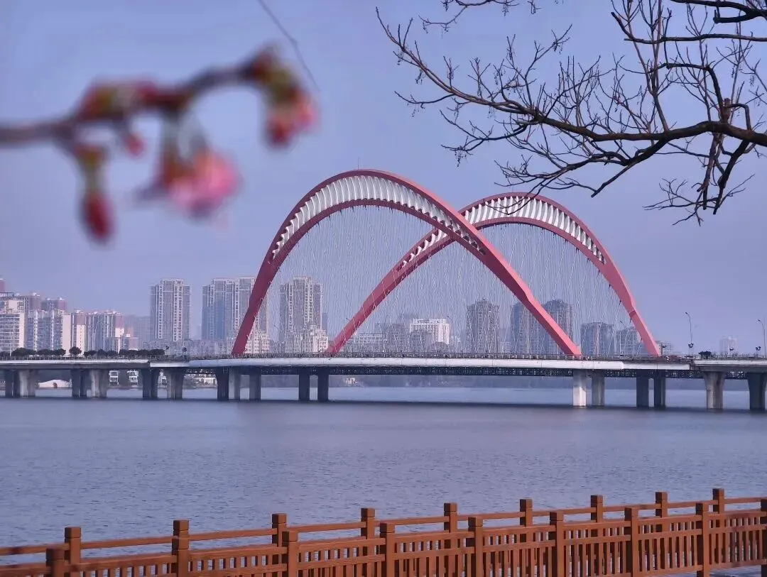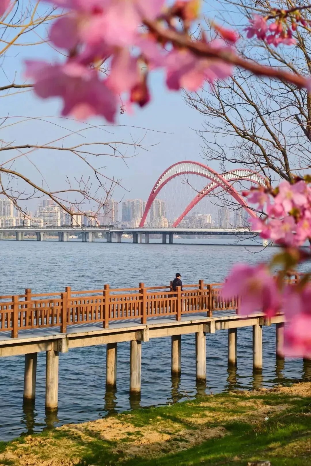 上周的晴日里,艾溪湖的樱花开得肆意又灿烂。漫步湖畔步道,1.2公里樱花长廊沿着艾溪湖缓缓铺展,粉白相间的樱花密密匝匝挂满枝头,与远处艾溪湖大桥的红色拱形轮廓相映成趣,现代建筑的硬朗线条撞上樱花的柔美,碰撞出独特的城市春日美学。