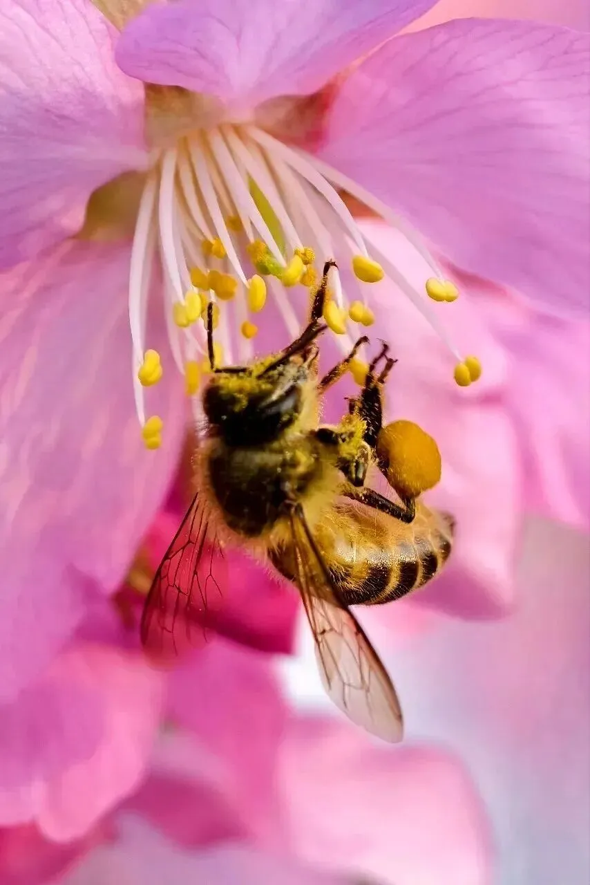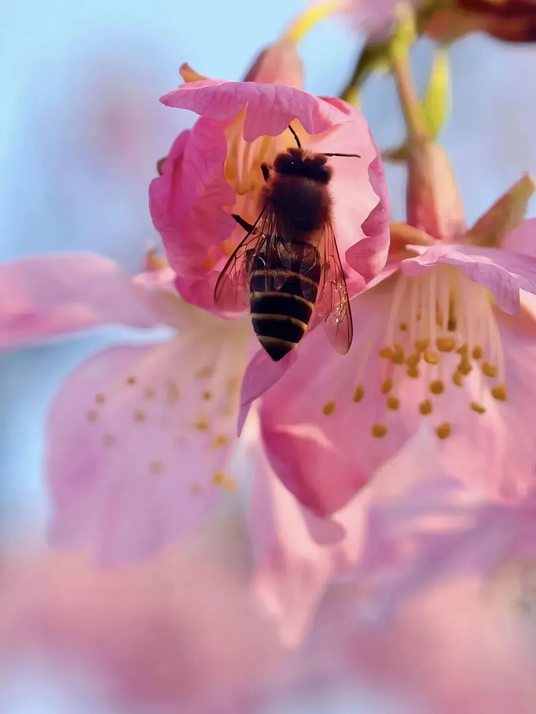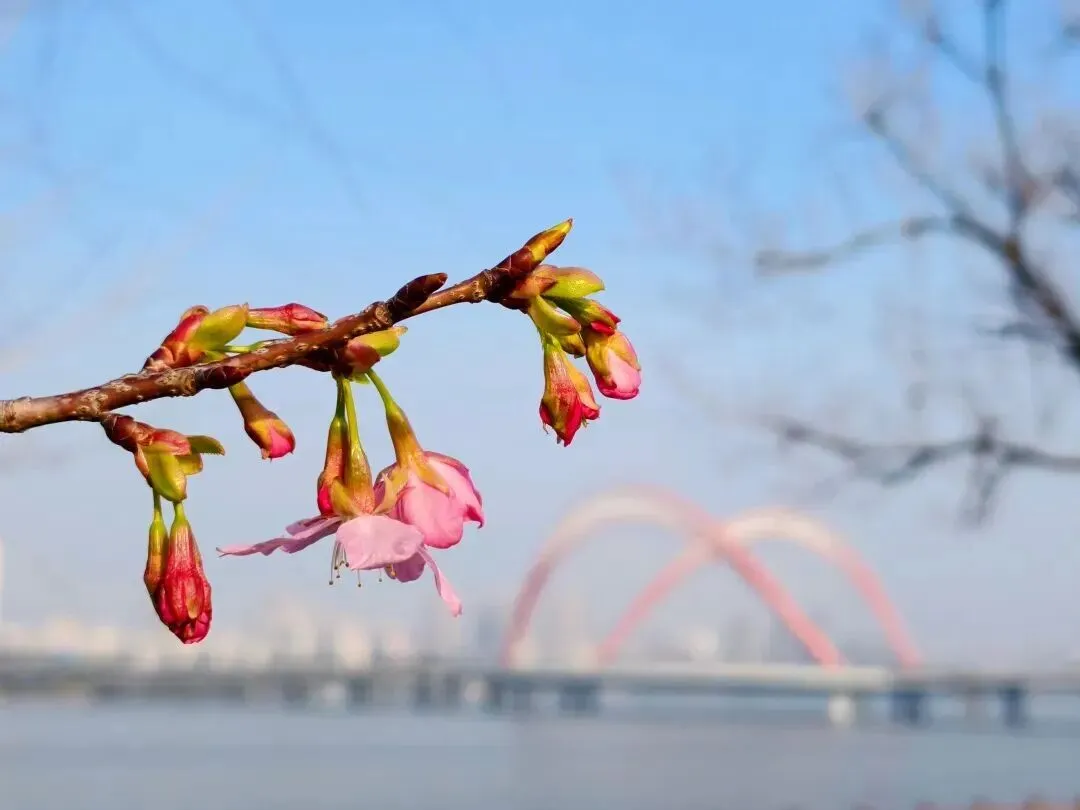 手机镜头轻轻拉近,就能定格樱花与大桥同框的经典画面——澄澈的湖水作底色,粉色花瓣作前景,大桥的弧线成为画面的点睛之笔,不用专业设备,也能拍出氛围感拉满的城市风光大片。低头细看,蜜蜂流连于花蕊间,花瓣纹理清晰可见,微距镜头下,每一朵樱花都藏着春日的细腻温柔。