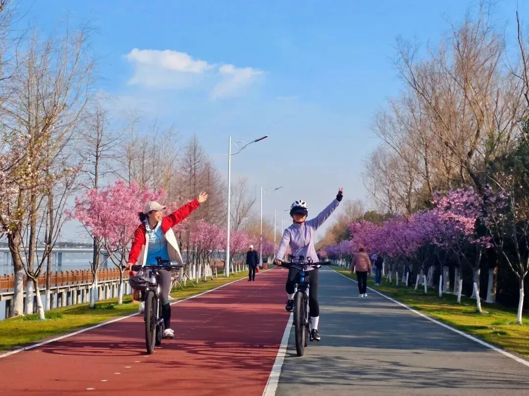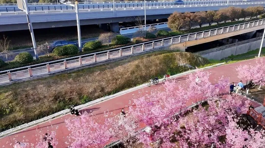晨光初照,樱花步道瞬间变成粉色画廊。骑行的朋友挥手致意,活力满满;小朋友倚着栏杆探秘花香,童真可爱;老爷爷手持麦克风高歌,意气风发。这一帧帧鲜活的画面,尽显春日美好!