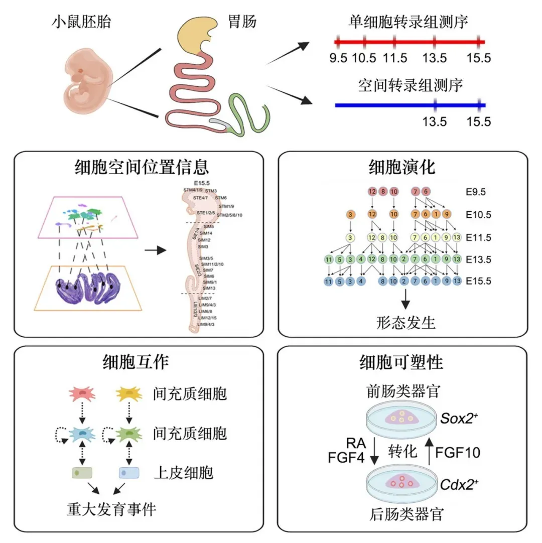 哺乳动物胚胎胃肠的发育经历了一系列重大事件,这些重大事件的顺利进行对于胃肠的正常发育至关重要。微环境信号,尤其是间充质—上皮细胞互作,在胚胎器官发育过程中扮演重要角色。然而,目前关于间充质—上皮细胞互作调控胚胎胃肠重大发育事件的研究十分匮乏,限制了我们对胃肠发育过程全面深入的理解。本论文通过对细胞亚群的演化轨迹和间充质—上皮细胞互作网络进行探究,为胃肠发育领域提供了重要的数据资源,深化了我们对细胞互作调控胃肠重大发育事件的理解。本研究将有助于揭示细胞、信号和发育之间的逻辑关系,为未来相关研究带来新的见解和突破。