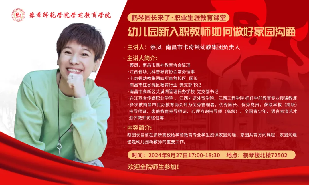 9月27日下午,我院邀请南昌市卡奇顿幼教集团负责人蔡凤在鹤琴楼北楼72502教室给学前教育学院224班级学生上了一堂关于幼儿园新入职教师如何做好家园沟通的职业生涯教育课。