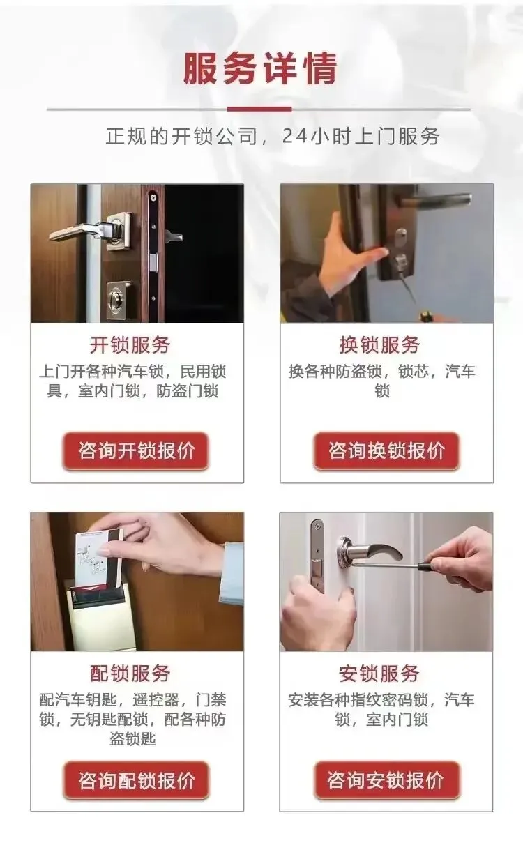- 紧急开锁:遇到紧急情况,我们会立即赶往现场,帮助您解决因丢失钥匙、锁具损坏等问题带来的困扰