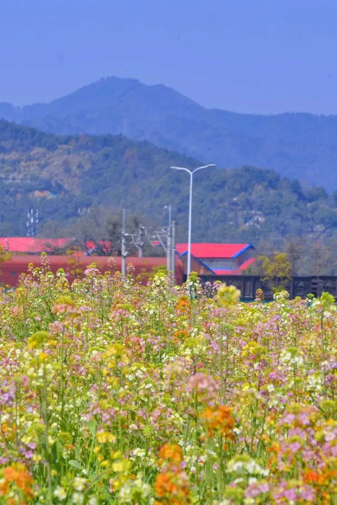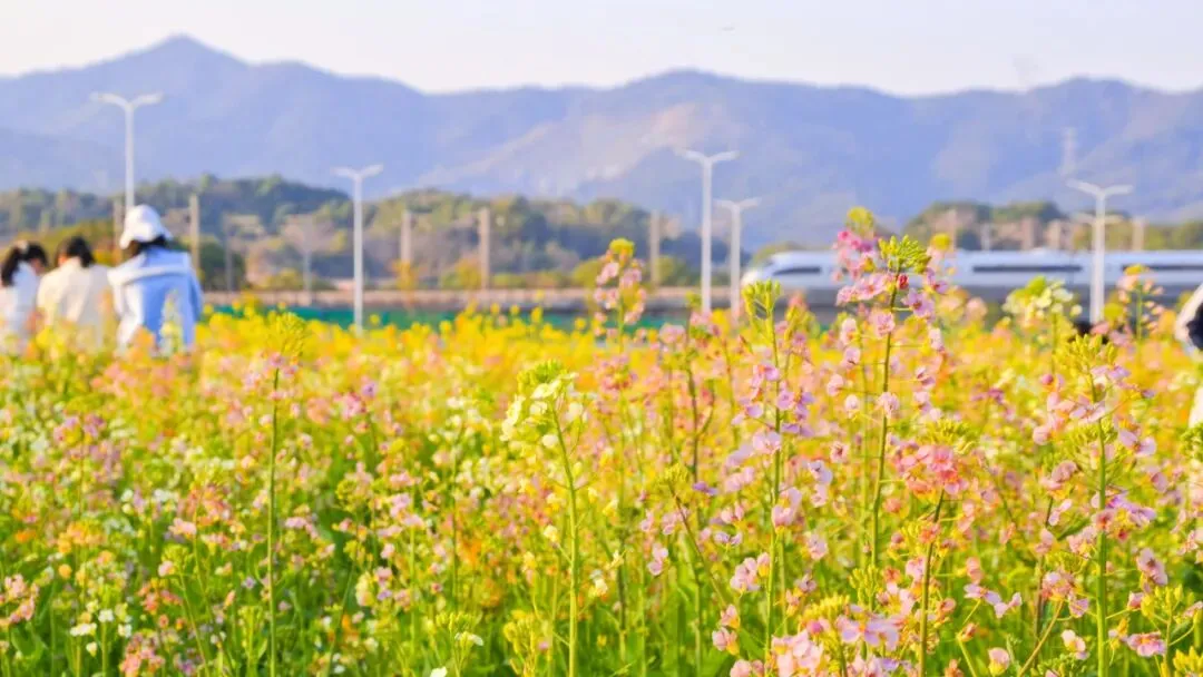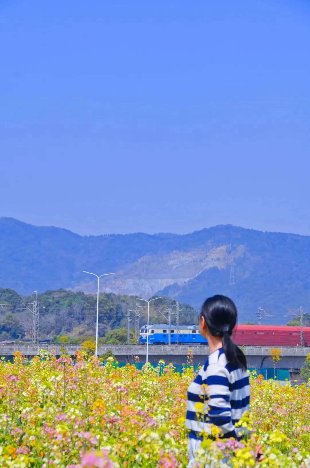 更让人印象深刻的是,在油菜花地里,不时看到有火车在前方呼啸而过,这让开往春天的列车具象化并定格。其实,我们在花海里遥看列车,列车里乘客也在注视春天里的花海,美就在我们彼此凝视的那一刹那相遇。