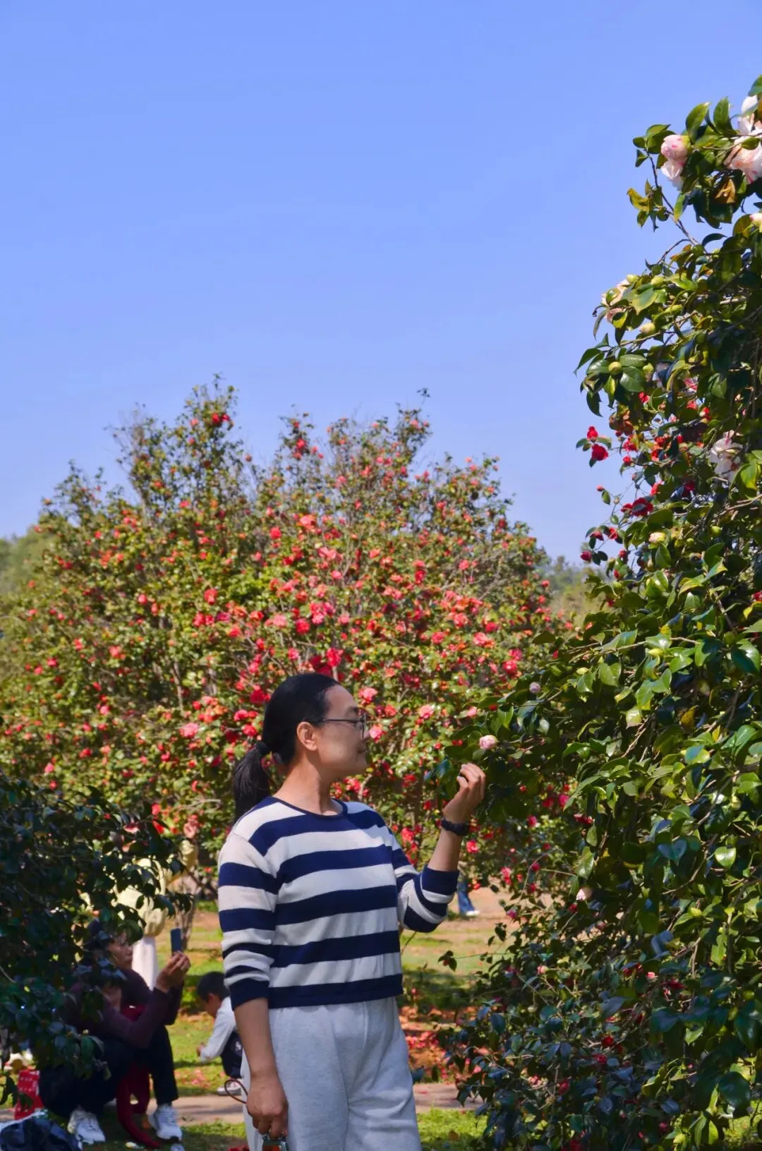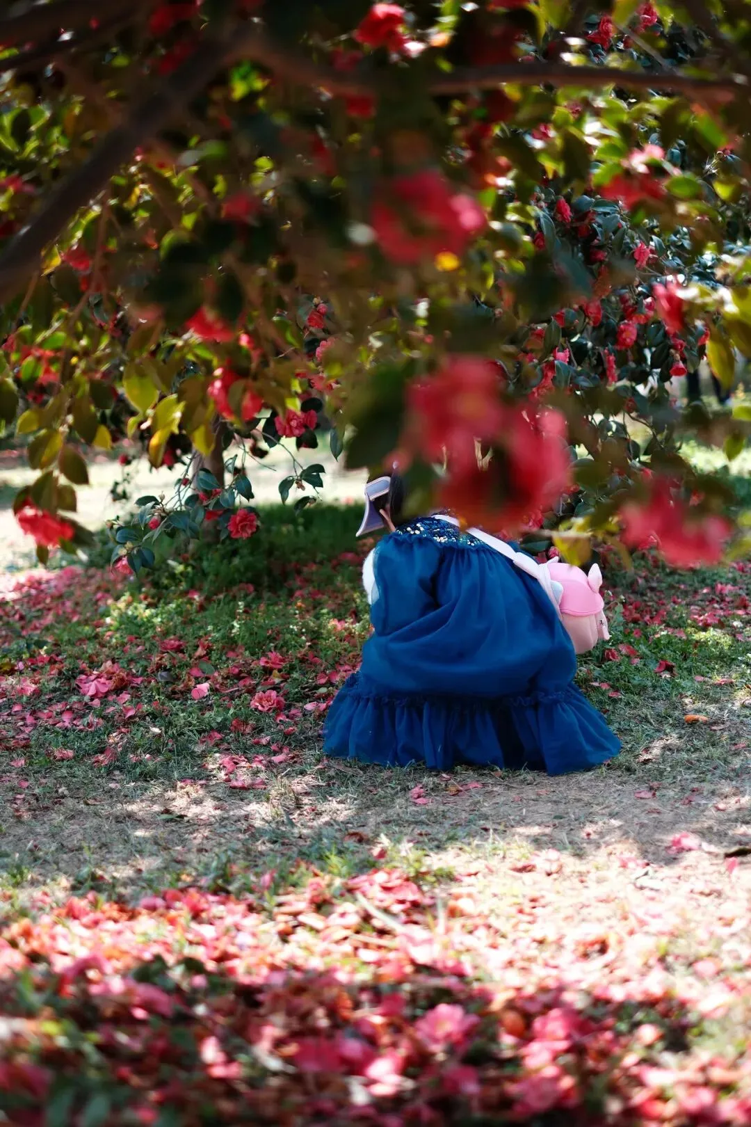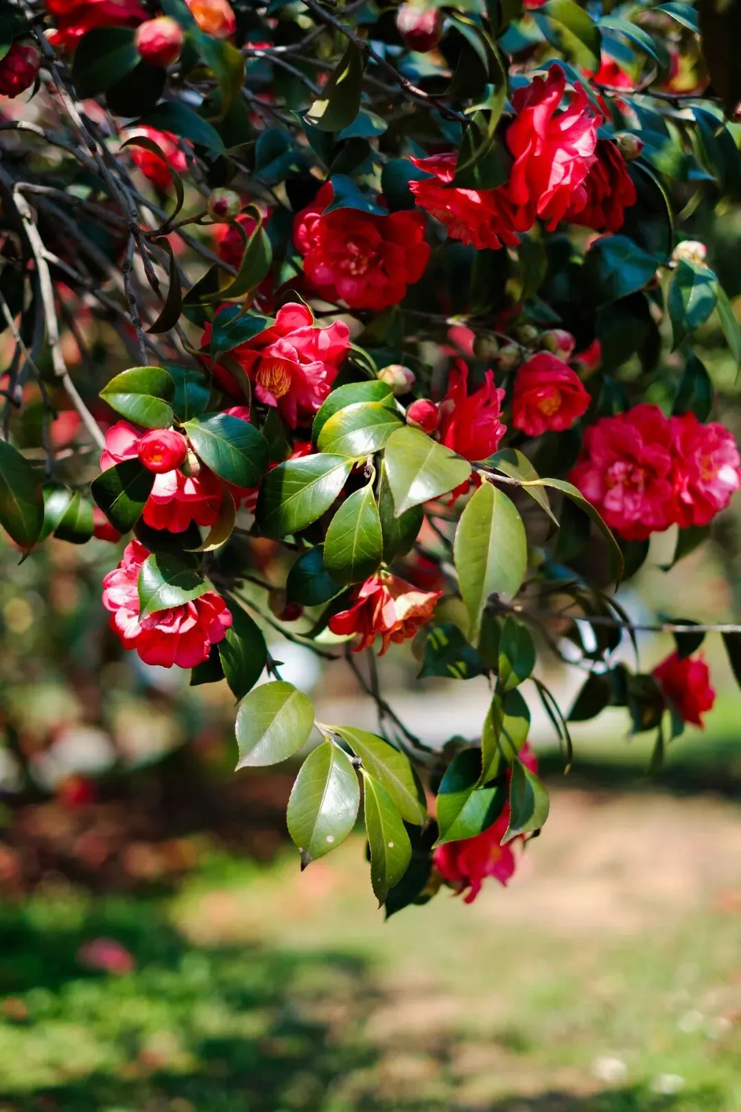 茶花花期很长,从初冬至春季,但春天茶花开的最肆意、最灿烂,尤其是林科院的茶花。从远处看,落地红花,与树上花朵,相应成趣,与追逐的孩童,构成了一幅幅唯美画卷。