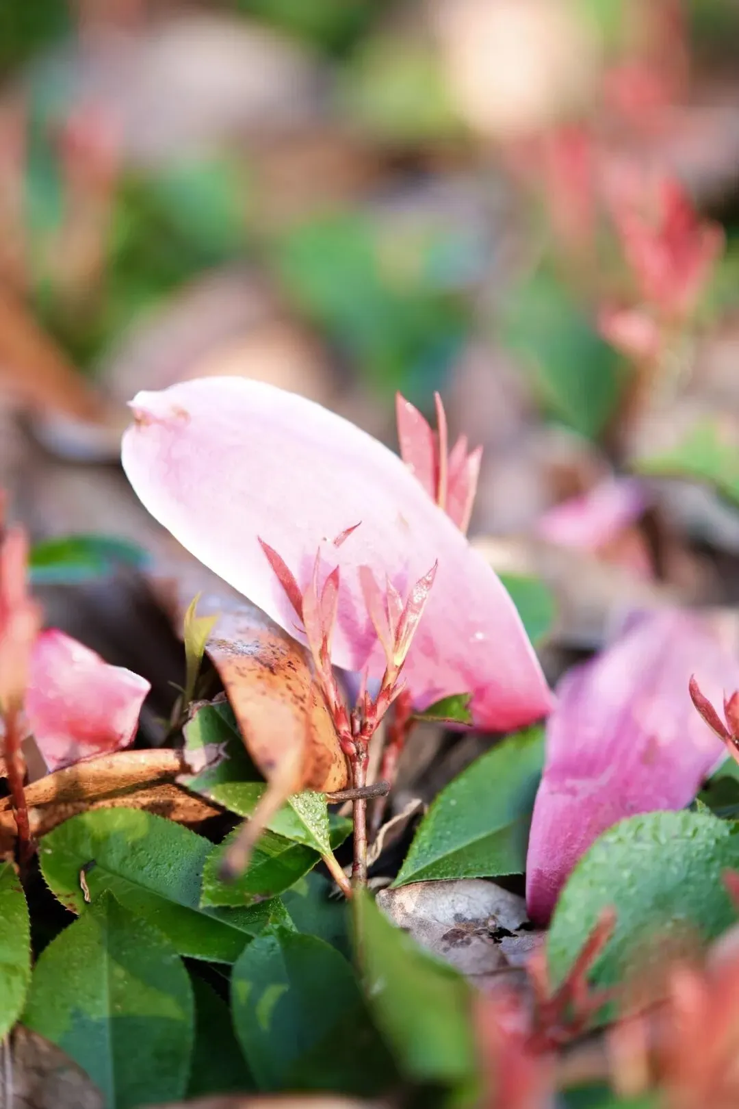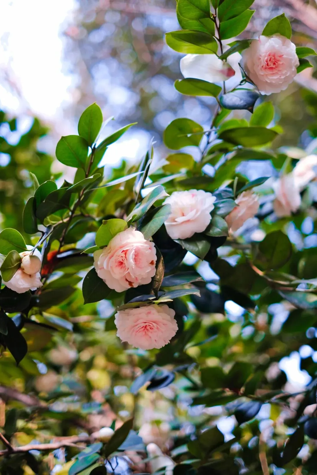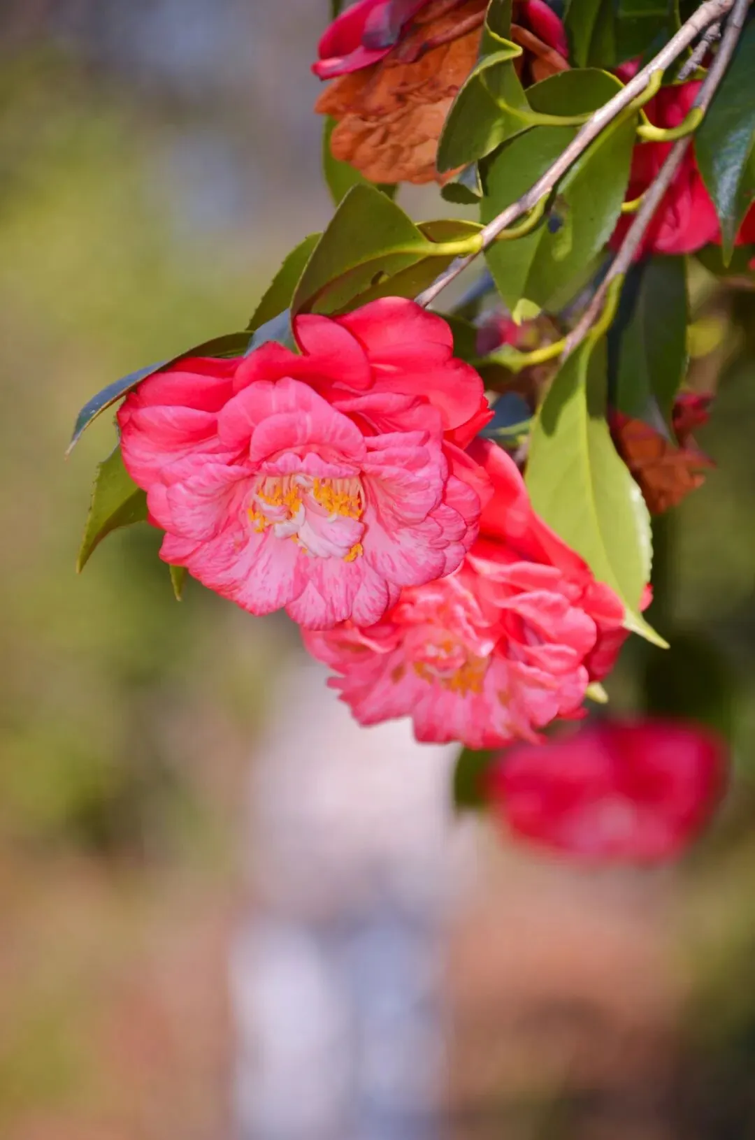 茶花花期很长,从初冬至春季,但春天茶花开的最肆意、最灿烂,尤其是林科院的茶花。从远处看,落地红花,与树上花朵,相应成趣,与追逐的孩童,构成了一幅幅唯美画卷。