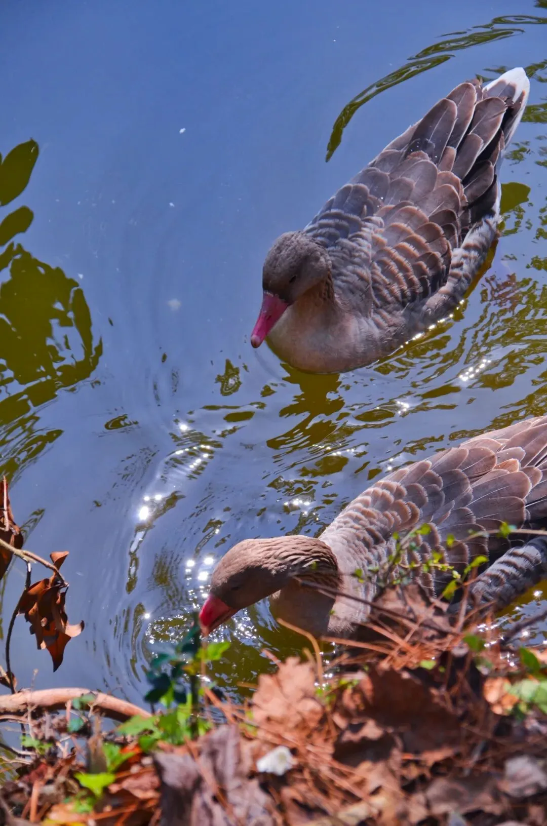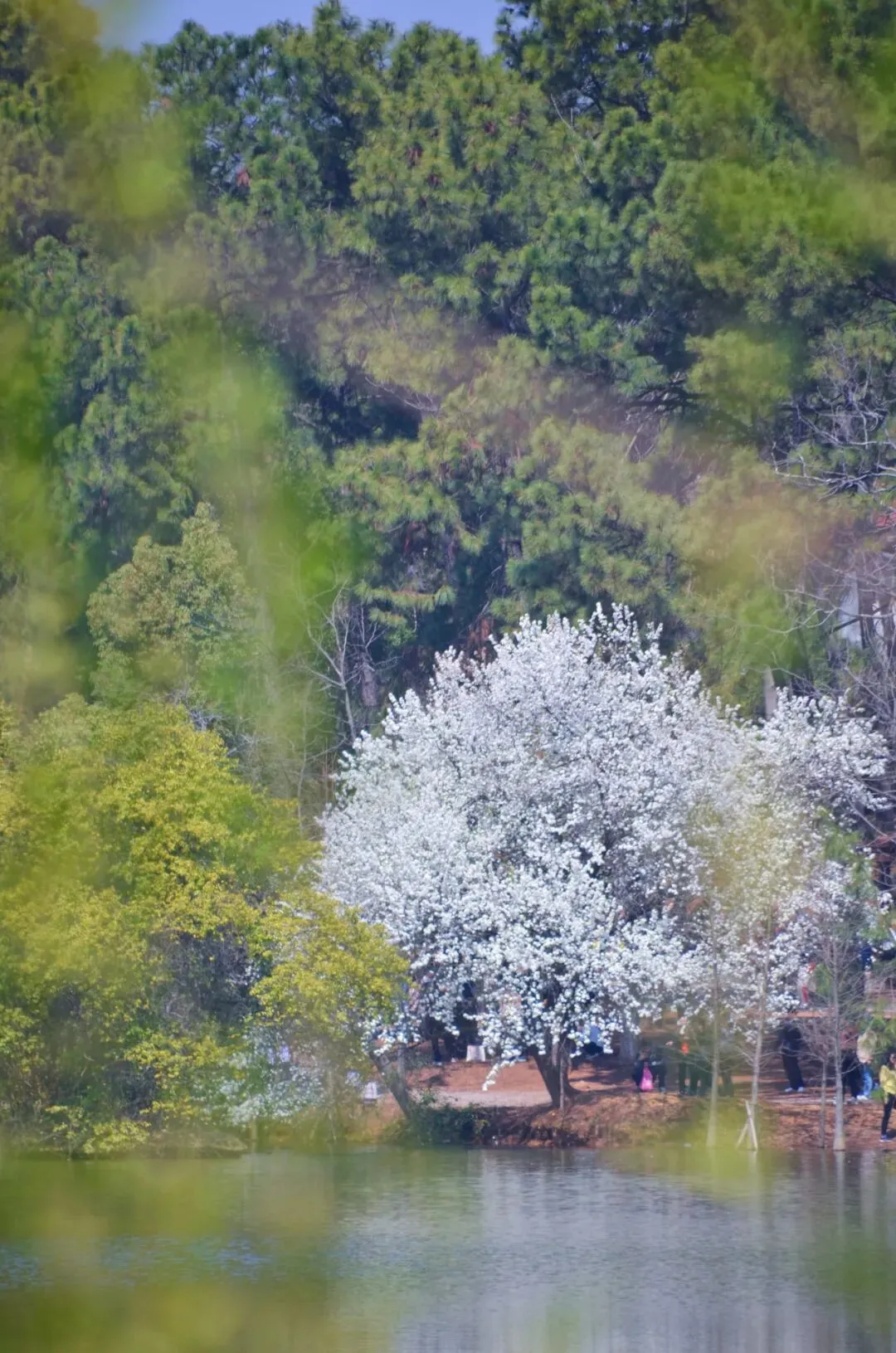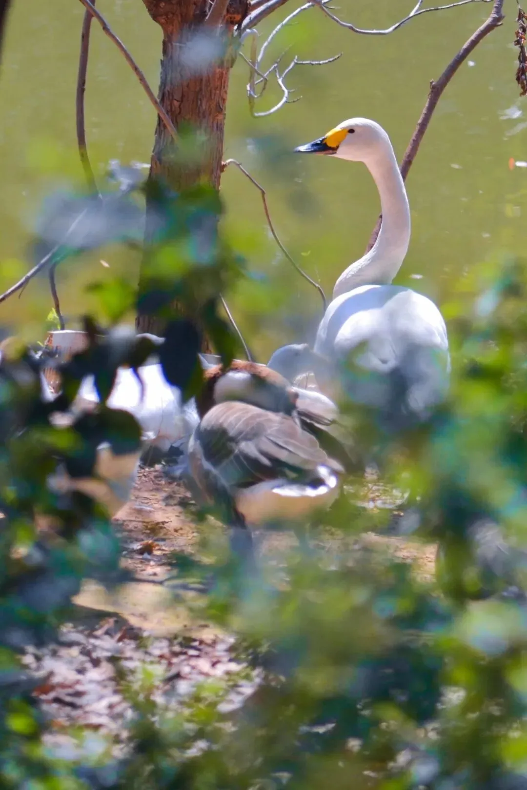 林科院的龙潭湖边,偶尔可以看到灰雁和小天鹅。灰雁喜欢在水里划行,小天鹅却不愿意下水,躲在岸上、伸着懒腰、晒着暖阳。湖边的大片樱花没开,但一株梨花却开得那么惊艳。