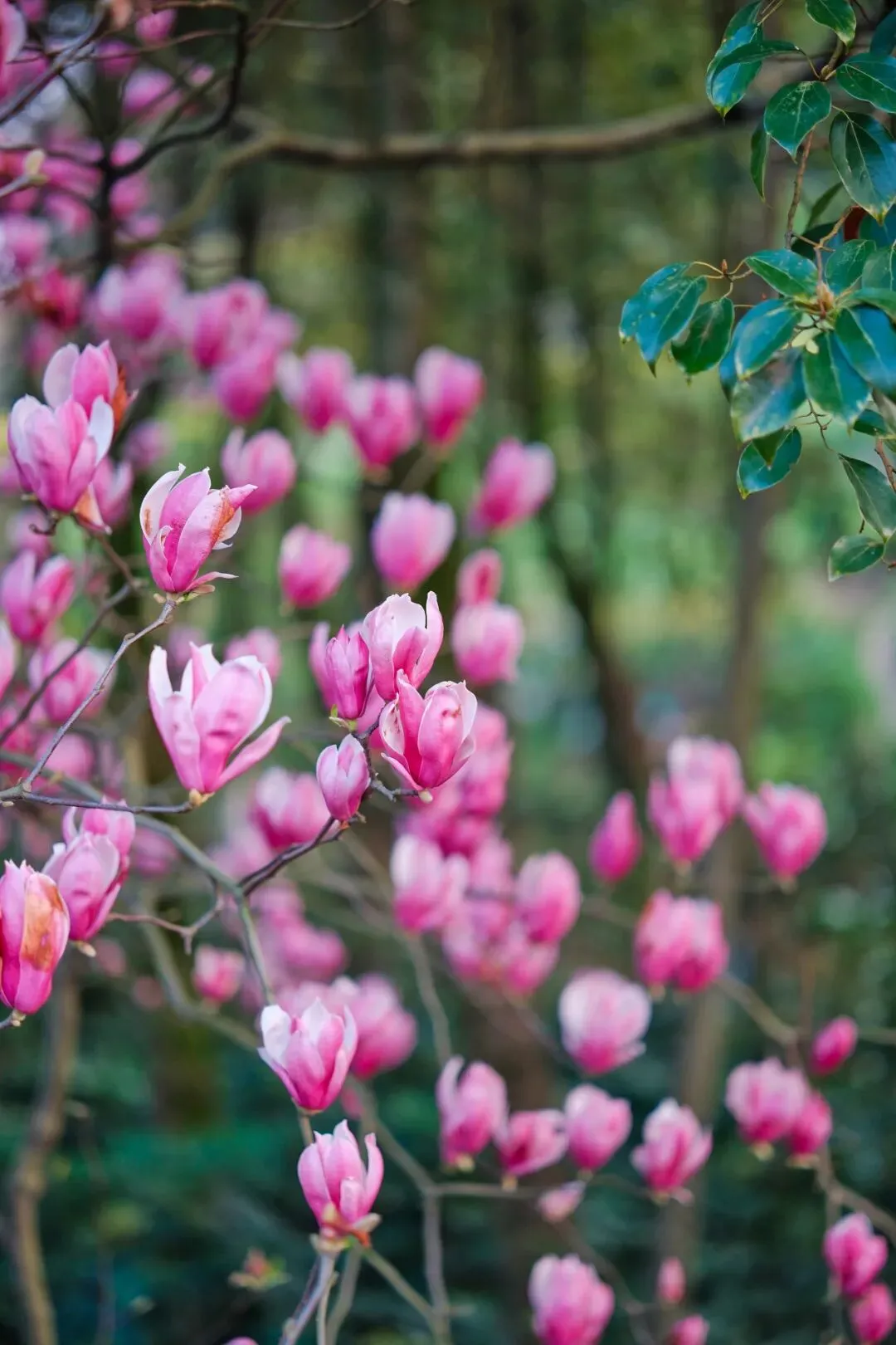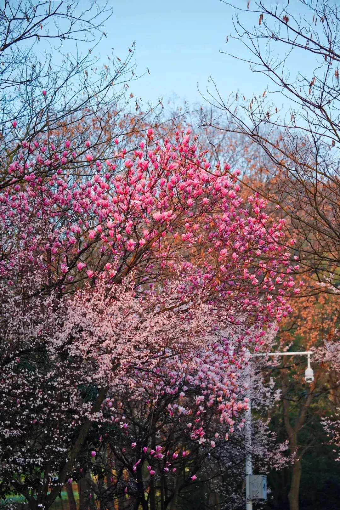 最惊艳的是,它与红叶李缠绕悱恻,上层玉兰如霞似火,下层红叶李细碎如雪,光秃秃的枝桠托着满树繁华,像把整个早春的明媚与温柔,都凝在了这一片流动的花海之中。当我们徜徉于这片花海之下,一种满心的幸福感边油然而生。