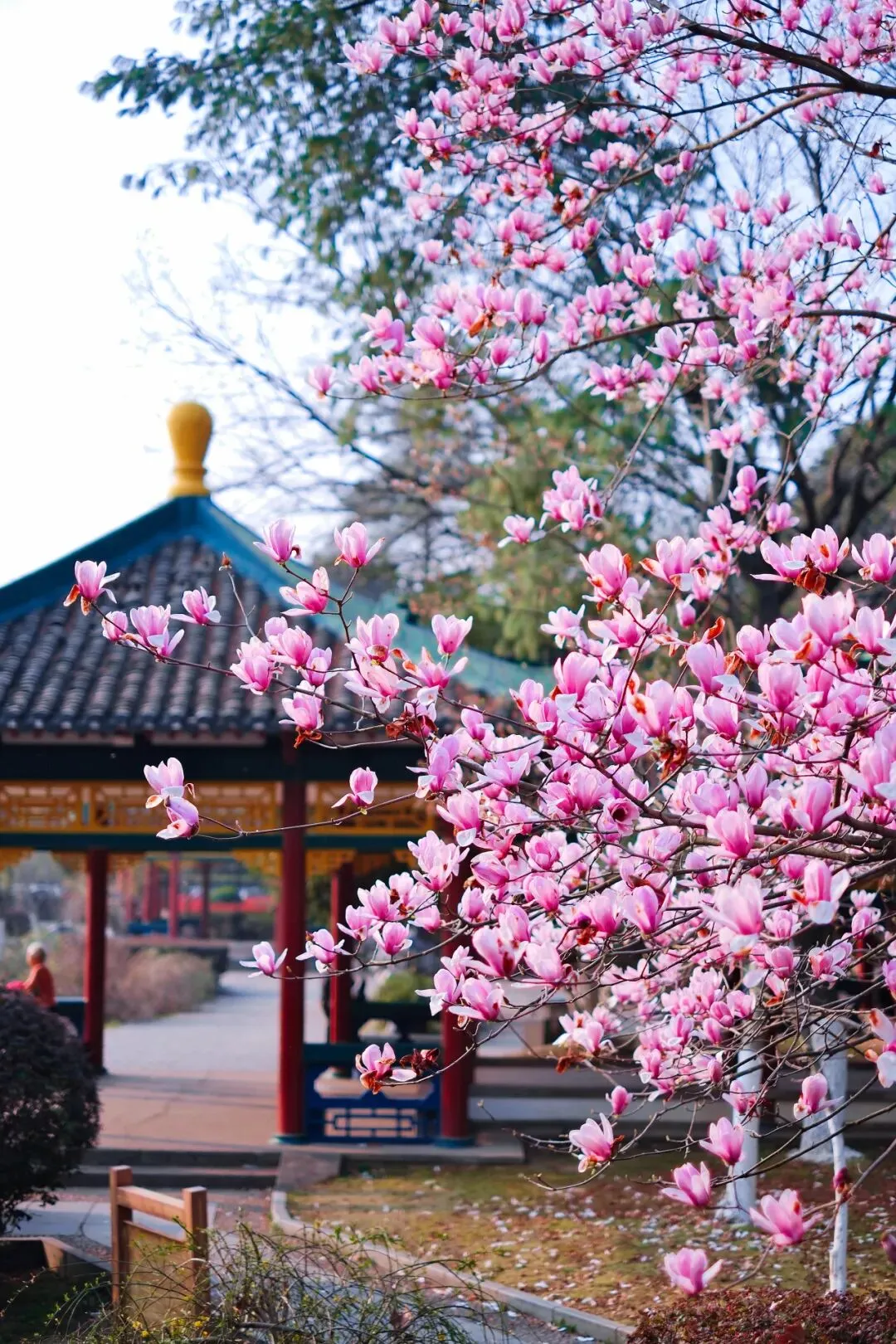 特别是它与古亭掩映,满树繁花探向黛瓦金顶,粉霞般的花簇映着朱红廊柱,把中式园林的雅致与春日的烂漫揉成了一幅活的工笔,连落在地上的花瓣都带着几分诗意。