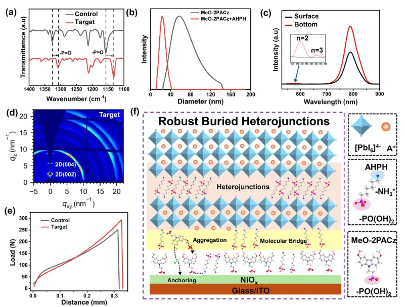 该研究证明了动态双锚定分子AHPH作为变革性界面"分子桥"的作用。其设计的功能基团首先抑制自组装单层聚集以形成均匀的接触层;在结晶过程中,未结合的AHPH迁移至界面,引导稳健的低维钙钛矿异质结原位生长。该分子桥同时实现了三项关键功能:通过建立良好连接的桥接层增强机械粘附、通过创建动力学势垒抑制离子迁移、以及作为模板引导高质量上层钙钛矿薄膜的结晶。具体机制包括:氨基与膦酸基团形成的分子间氢键网络抑制MeO-2PACz的二维平面聚集趋势;动态配体交换引导的2D/3D异质结形成;近Dion-Jacobson相结构强化界面稳定性;以及延迟成核和奥斯瓦尔德熟化过程改善薄膜质量。该协同界面工程策略将自组装单层优化与稳定化埋入式异质结构建无缝整合,通过单一动态调控剂实现了界面稳定化、离子阻挡和结晶控制的统一,为耐用钙钛矿光伏器件提供了清晰的途径。这项工作建立了一种通用的分子级策略,对推动钙钛矿太阳能电池的商业化应用具有重要意义。