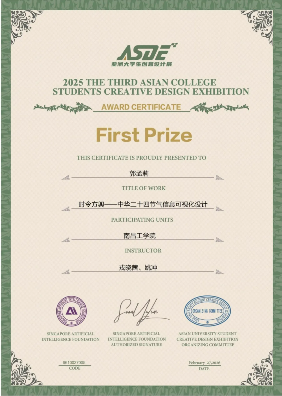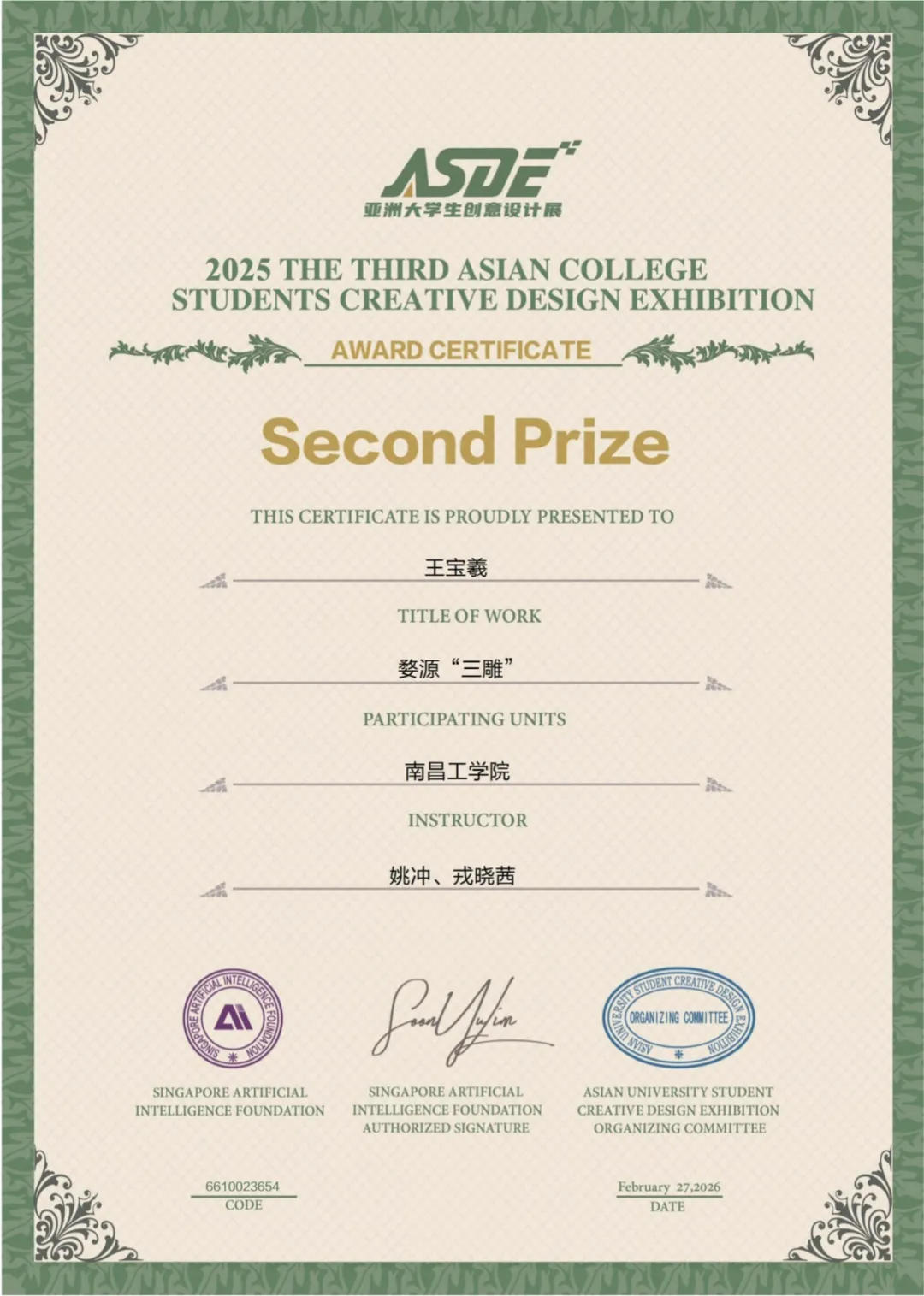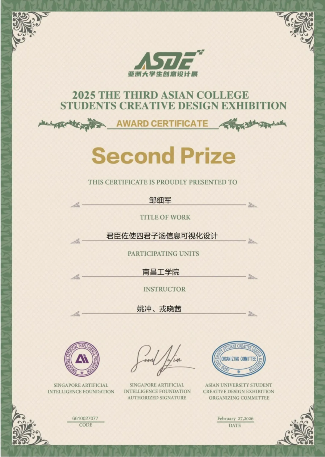 新加坡人工智能基金会(SINGAPOREARTIFICIALINTELLIGENCEFOUNDATION)主办,亚洲大学生创意设计展组委会承办,以“自由主题”为创作导向,鼓励参赛者围绕人工智能、国潮非遗、乡村振兴等社会热点展开设计探索,吸引了亚洲各国专业设计师、设计机构及艺术院校师生踊跃参与,是亚洲范围内极具影响力的高规格设计赛事。