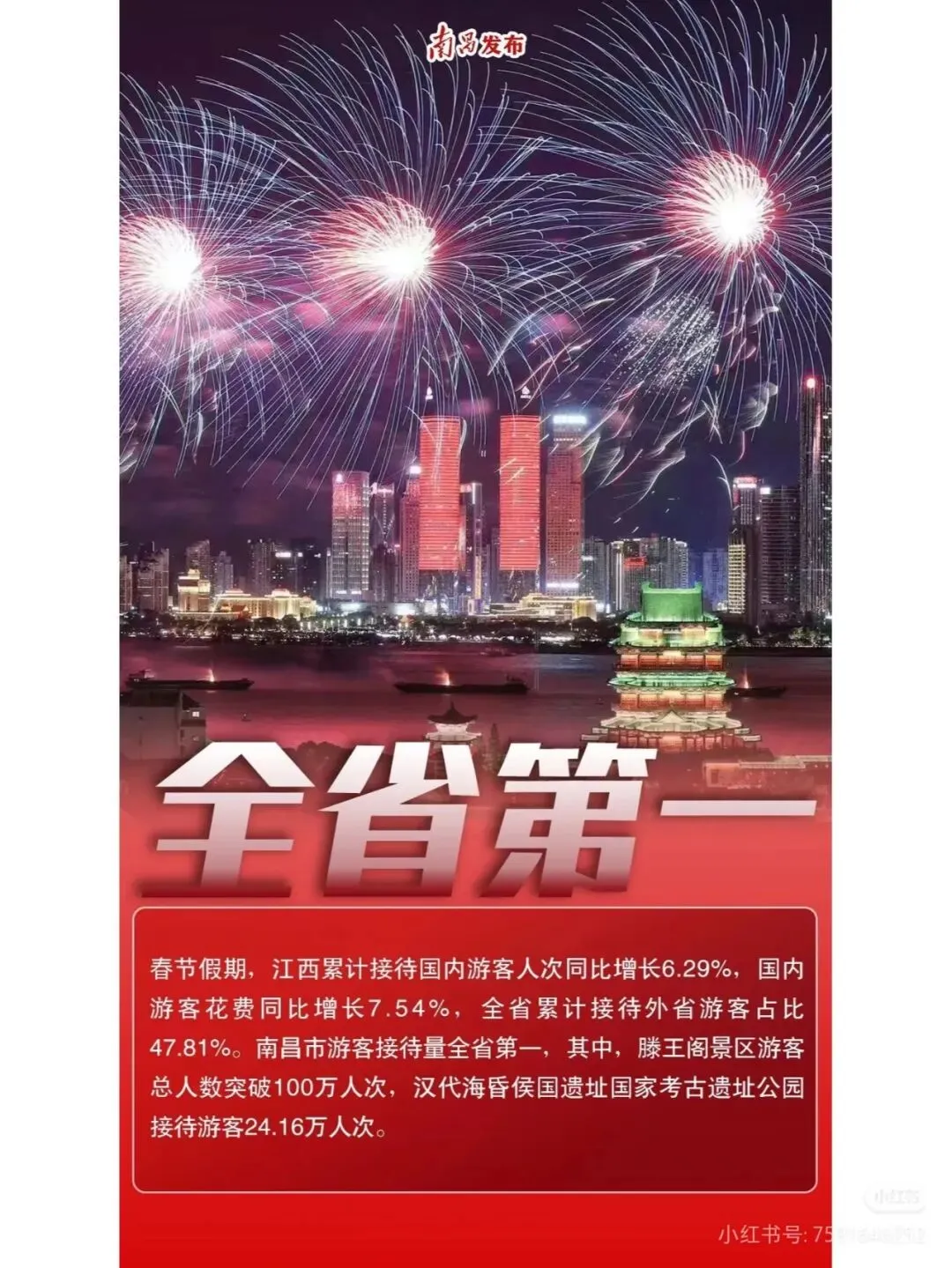 而且!春节假期江西旅游数据超亮眼,全省接待国内游客人次同比增长 6.29%,游客花费增长 7.54%,南昌游客接待量全省第一。滕王阁景区游客破百万,海昏侯遗址公园也接待了 24.16 万人次游客。文化底蕴加上经济实力,南昌真的越来越有吸引力!