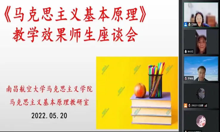 为了深入学习贯彻落实党的十九届六中全会精神、习近平总书记4月25日在中国人民大学考察时的重要讲话精神和习近平总书记在庆祝中国共产主义青年团成立100周年大会上的重要讲话精神,贯彻落实中共江西省委教育工委、江西省教育厅关于《进一步推进“问题式专题化团队教学改革”工作方案》的通知要求,推动思政课改革创新,推进思政课高质量发展,全面推动习近平新时代中国特色社会主义思想进教材、进课堂、进头脑,增强思政课的思想性、理论性和亲和力、针对性,2022年5月20日晚,南昌航空大学马克思主义学院“马克思主义基本原理”(以下简称原理)教研室召开教学效果师生座谈会。