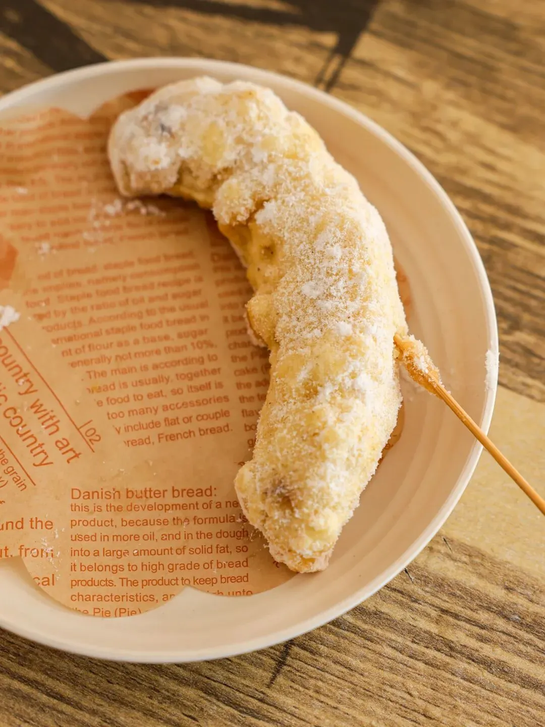 而炸香蕉确实是好吃的,裹好一层脆皮面糊下锅油炸,出锅的时候再撒上一层白糖粉,脆壳之下绵软的香蕉果肉微微带点酸味,与糖粉的甜形成一个极致的反差。