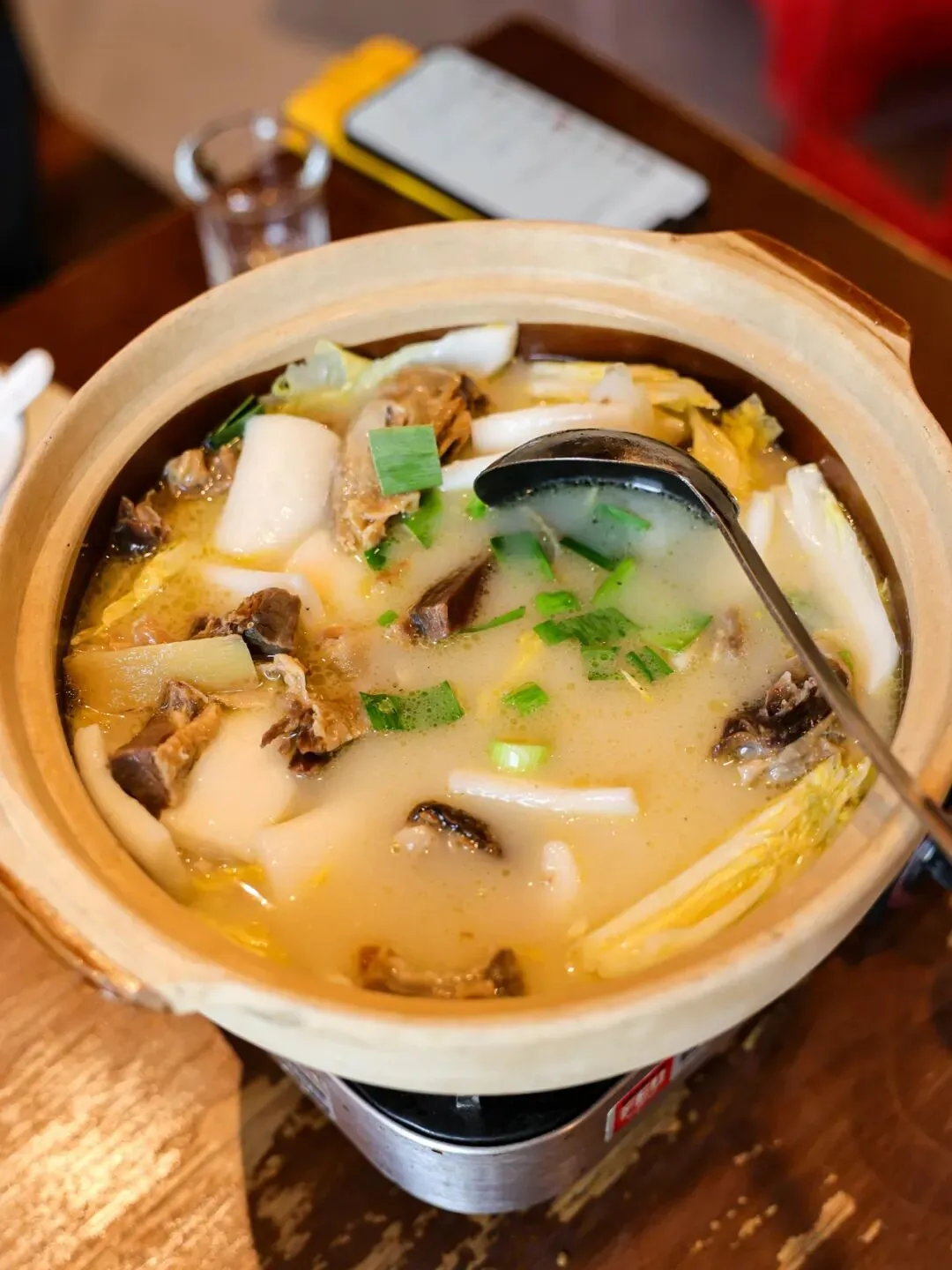 汤底之下加了很多年糕和白菜,咸味的鸭汤底中带有白菜的甜。但是年糕质量比较一般,稍微煮一煮就糊烂在汤里了,让这份菜吃起来黏肚子的同时,又不太能充分感受汤底鲜味带来的滋味。人多的话可以点点,一两个人还是别点了。