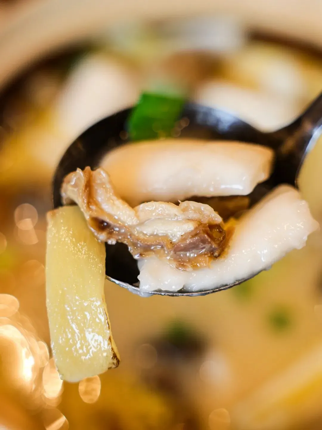 点这道菜的时候我们以为很小一份,结果端过来巨大一盆,四个人吃都绰绰有余的那种。江西用来炖汤的板鸭更接近风干的咸鸭肉,单独吃的话其实偏咸,但是炖出来的汤鲜味很浓郁。