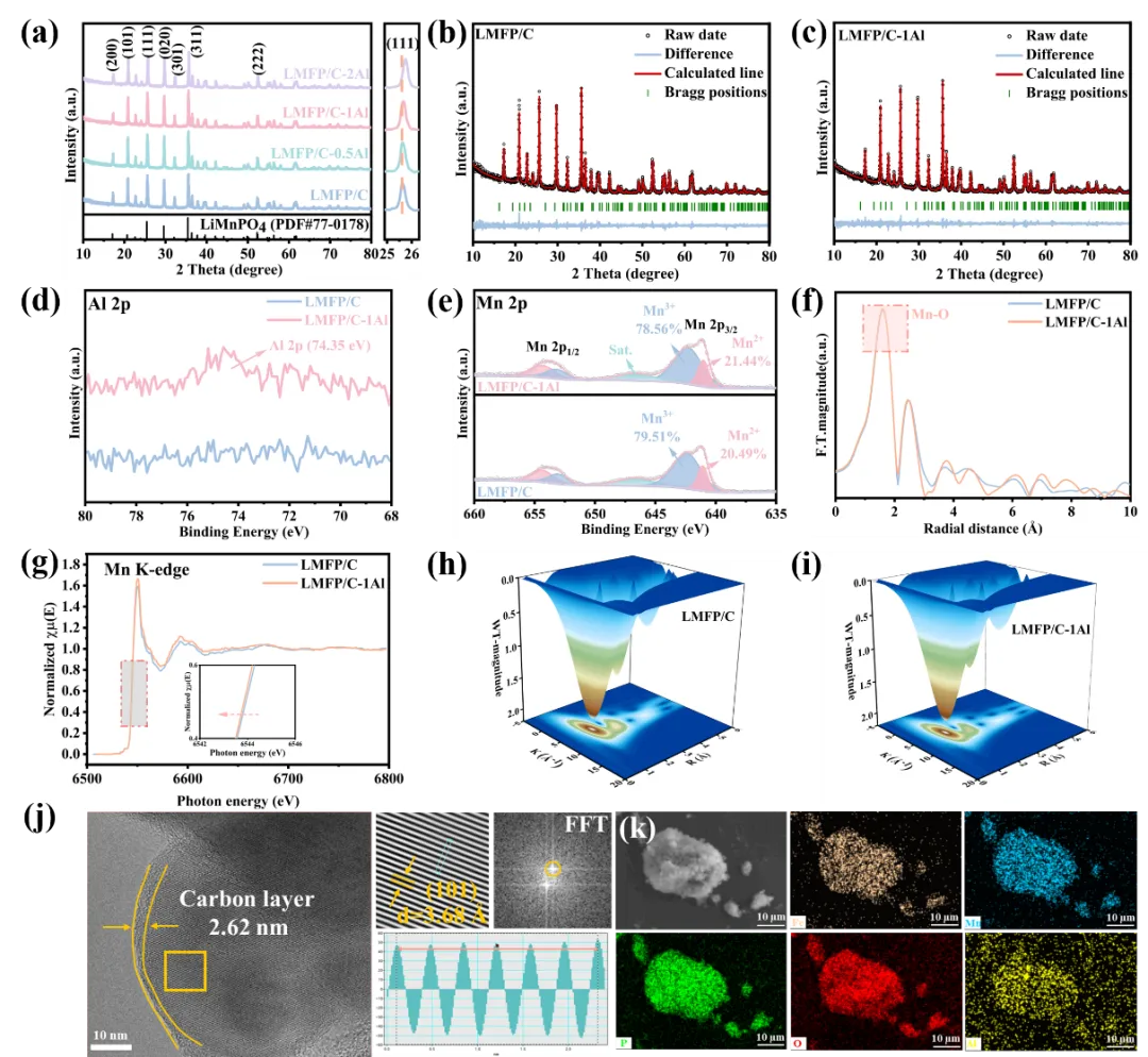 图1.(a)所有样品的XRD图谱;LMFP/C和LMFP/C-1Al:(b,c)结构精修图谱;(d)Al 2p和(e)Mn 2p的XPS图谱。(f)拟合的EXAFS光谱;(g)Mn-K边的XANES光谱;(h,i)Mn-K边小波变换图;(j)LMFP/C-1Al的HRTEM图像;(k)LMFP/C-1Al的EDS图。