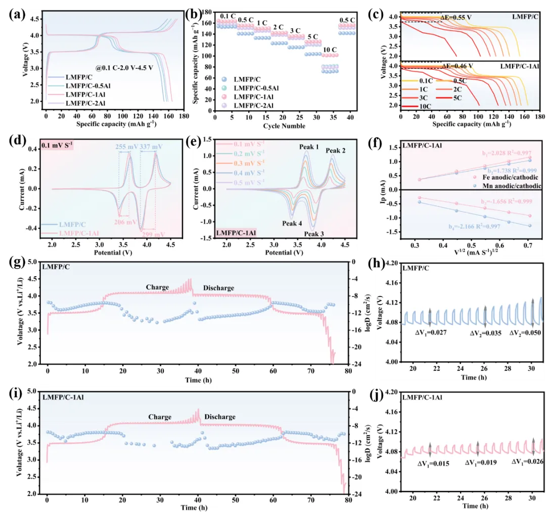 图2.(a)0.1 C下的初始充放电曲线;(b)倍率性能;LMFP/C和LMFP/C-1Al:(c)不同倍率下的放电曲线;(d)0.1 mV s-1扫描速率下的CV曲线;(e)不同扫描速率下的CV曲线;(f)峰电流与扫描速率平方根的线性拟合图;(g-j)GITT测试分析