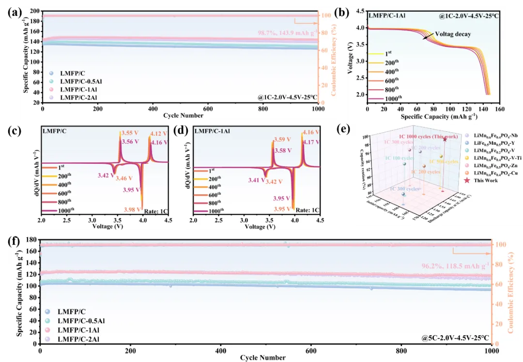 图3.(a)1 C下的循环性能;(b)LMFP/C-1Al在不同循环次数下的放电曲线;(c)LMFP/C和(d)LMFP/C-1Al的dQ/dV曲线;(e)电化学性能对比;(f)5 C下的循环性能