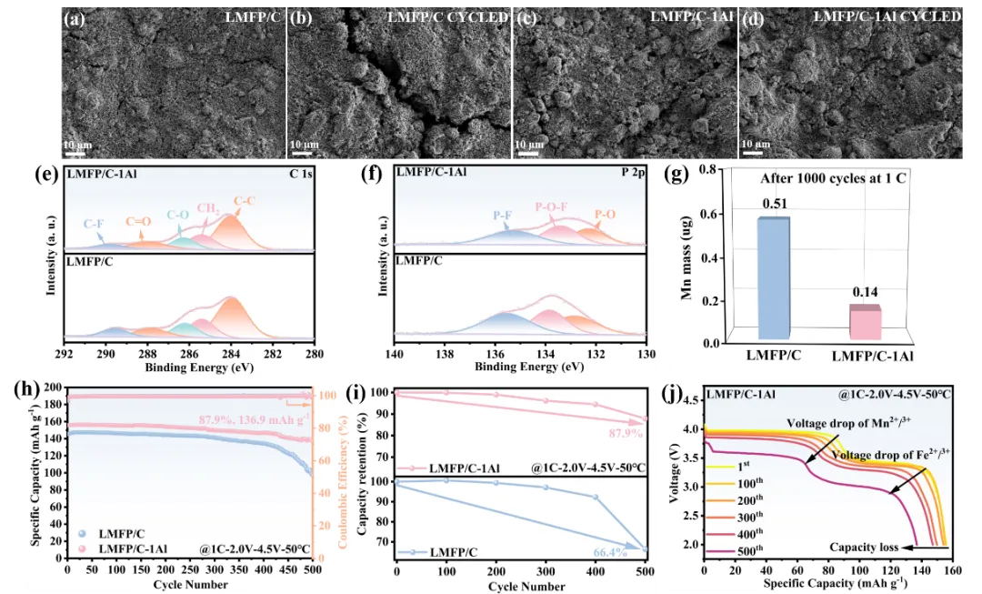 图4. LMFP/C和LMFP/C-1Al:(a-d)循环前后的SEM;循环后(e)C 1s和(f)P 2p的XPS;(g)循环后的Mn溶解对比;(h-i)1 C和50 °C下的高温性能