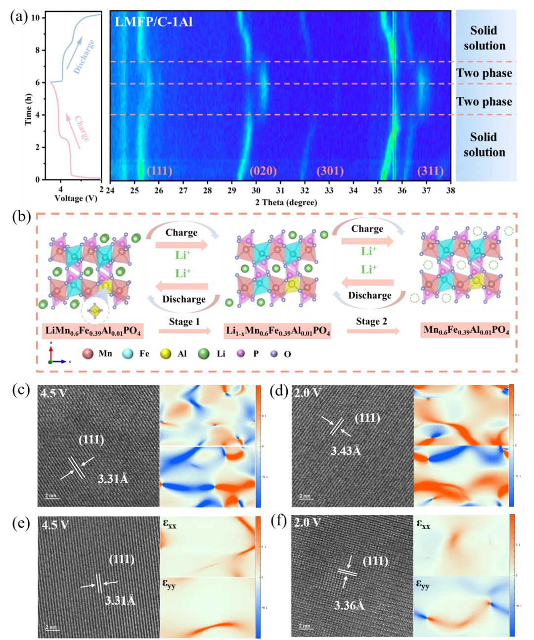 通过原位XRD分析揭示了LMFP/C-1Al在充放电过程中的相变机制,发现Al掺杂缩短了相变区域,减少了相界面应力,提高了结构可逆性。此外,基于(111)晶面的应变映射显示,无论在脱锂还是嵌锂状态下,LMFP/C-1Al的应变条纹均明显弱于未改性样品,这表明Al掺杂有效减轻了局部晶格应变,增强了结构稳定性,从而抑制了Jahn-Teller畸变引起的结构退化。