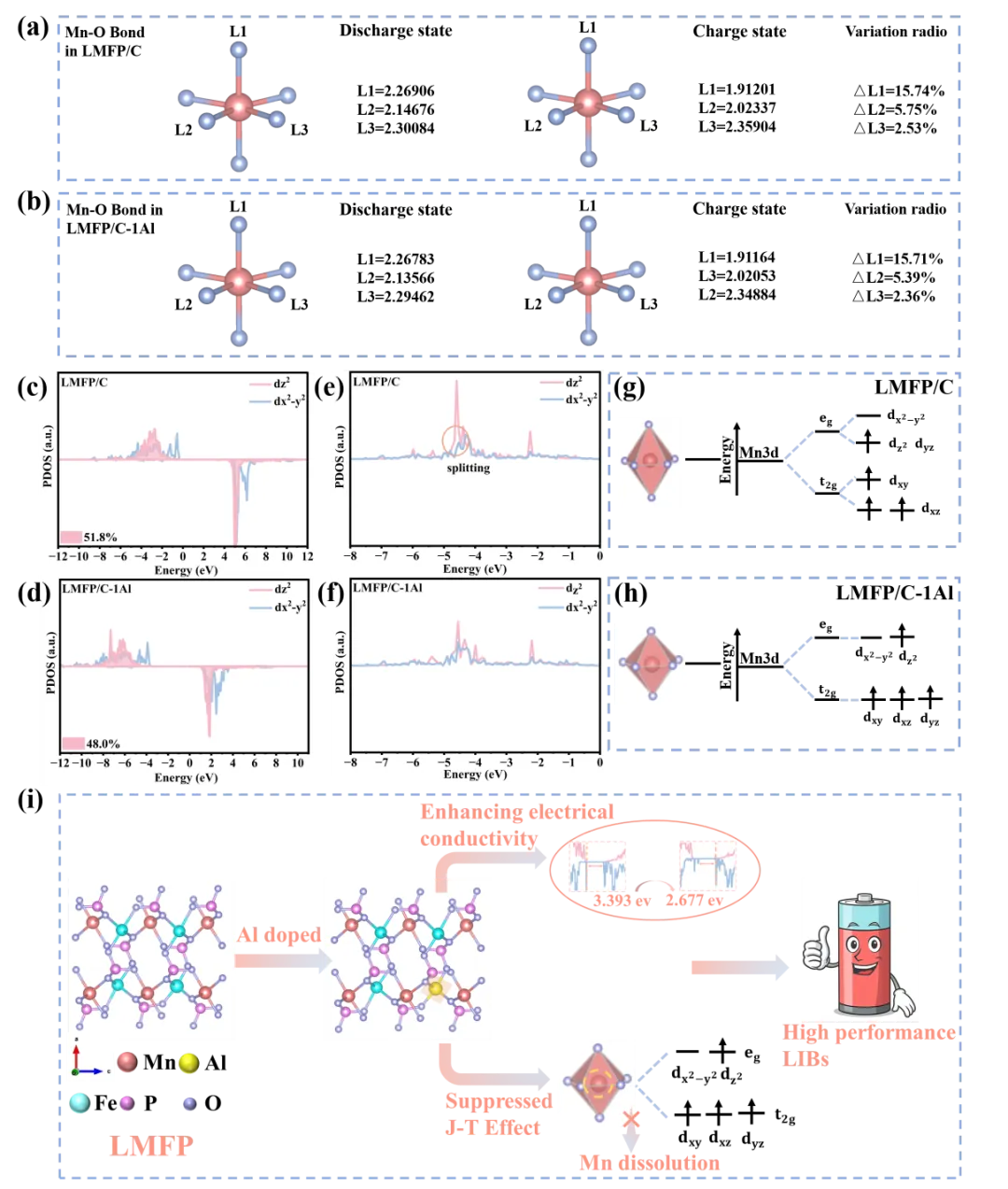 图6.(a-b)充放电过程中Mn-O的键长变化;(c-d)放电状态下LMFP/C与LMFP/C-1Al的dx2–y2和dz2轨道的PDOS;(e-f)充电状态下LMFP/C与LMFP/C-1Al的dx2–y2和dz2轨道的PDOS;(g-h)Mn3+电子构型示意图;(i)通过Al掺杂策略构建高性能LMFP的机制示意图