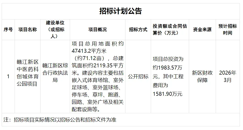 近日,江西省公共资源交易网发布了赣江新区中医药科创城体育公园项目招标计划公告。