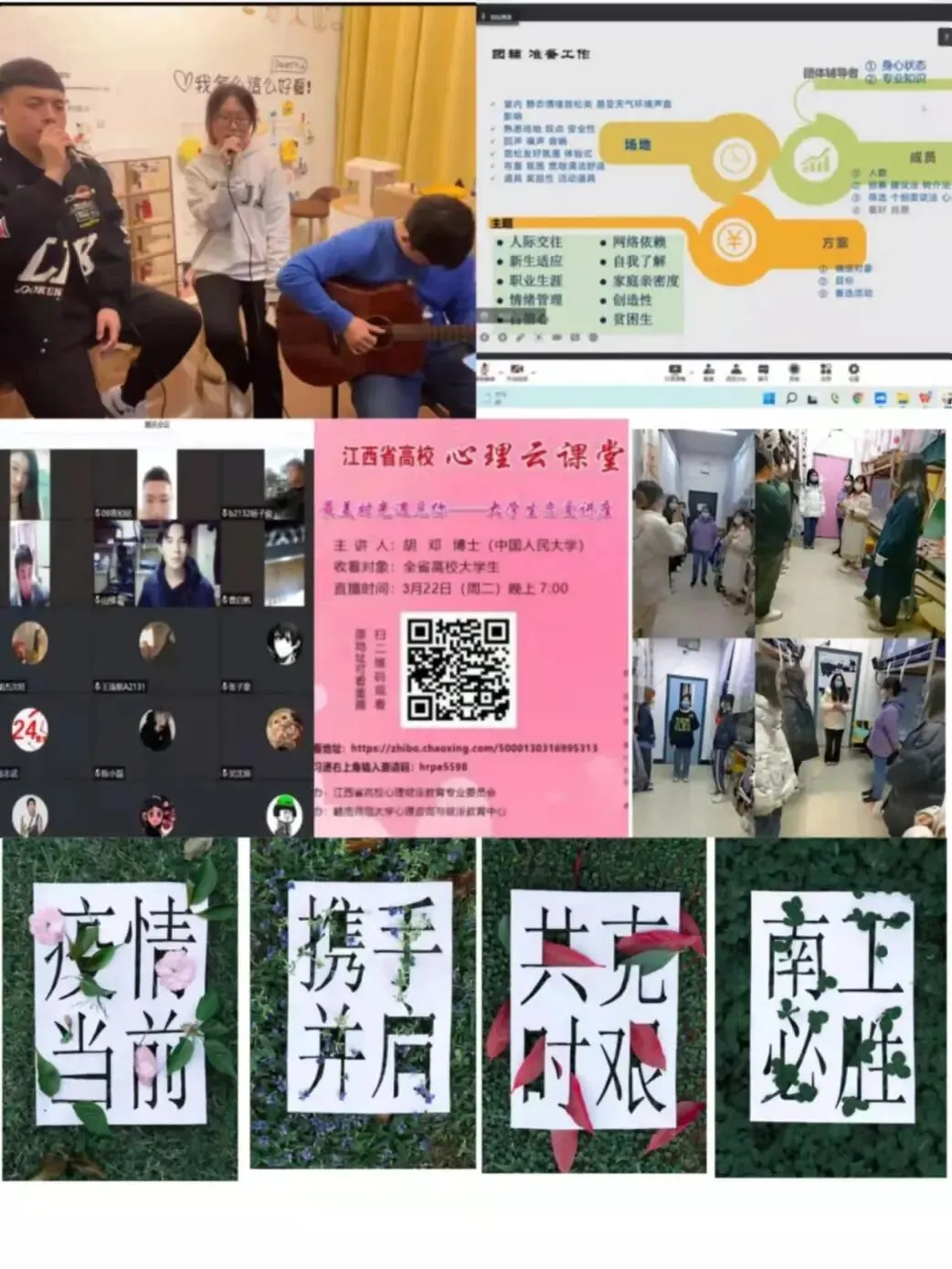 为了满足疫情防控期间学生心理健康教育活动的需求,南昌工学院大力倡导拓展心理健康云活动,一系列丰富多彩的线上心理活动涌现出来。“同心抗疫,‘音’为有我”主题活动用音乐抚慰心灵、手工创意剪纸传递爱与团结的力量、线上心理团体辅导与探讨开辟新方法、“大学生恋爱”讲座让你遇见更好的自己、“互联网+就业指导”为梦想导航等等。疫情之下多维拓展心理健康教育活动,为学生注入抗疫心能量,增强心理免疫力。