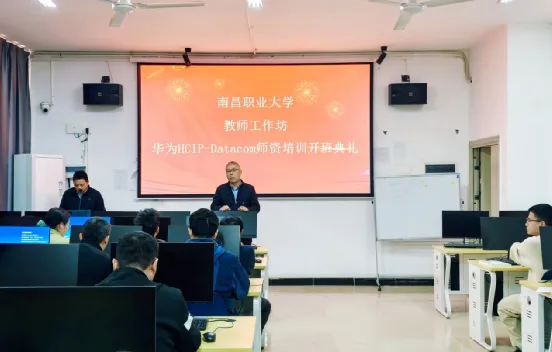 南昌职业大学信息技术学院为进一步提升网络教研室教师专业技术能力,夯实师资队伍建设,推动课程体系与行业技术精准衔接,特邀我司于2026年3月13日主办教师工作坊华为HCIP-Datacom技术能力培训。信息技术学院副院长史继峰出席开班仪式,网络教研室24位教师参加培训。此次培训由学院精心组织,我司承办,旨在通过校企合作助力教师掌握前沿网络技术,提升实践教学水平。