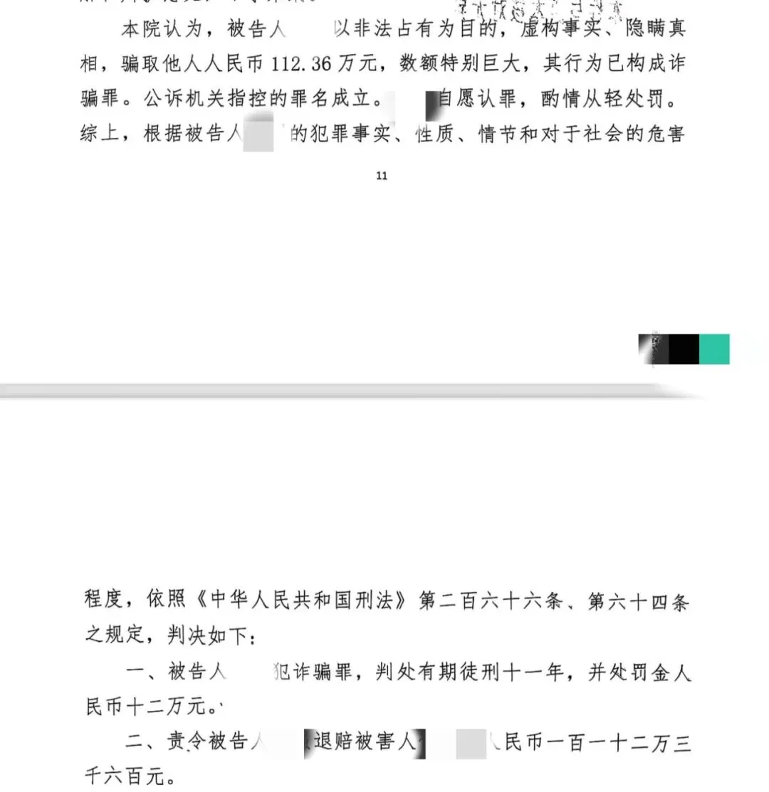 根据我国刑法规定,诈骗罪的法定刑,50万以上是十年起步。在南昌的司法实践中,超过50万部分,每5万增加一个月刑期。这样算下来112万减去50万为62万,62万除于5等于12.4个月也就是1年左右,刨除自愿认罪等酌情从轻的情节,综合下来判刑11年左右,这个案件最终被法院判处11年有期徒刑。