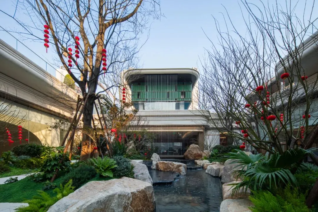 这种震撼的感觉,在走进中庭进一步加深,进门以后有一大片水景,在水景中间,有一栋墨绿色陶板做成的盒子,让人仿佛看到了宝格丽的影子,非常具有辨识度。