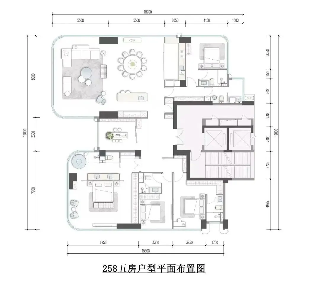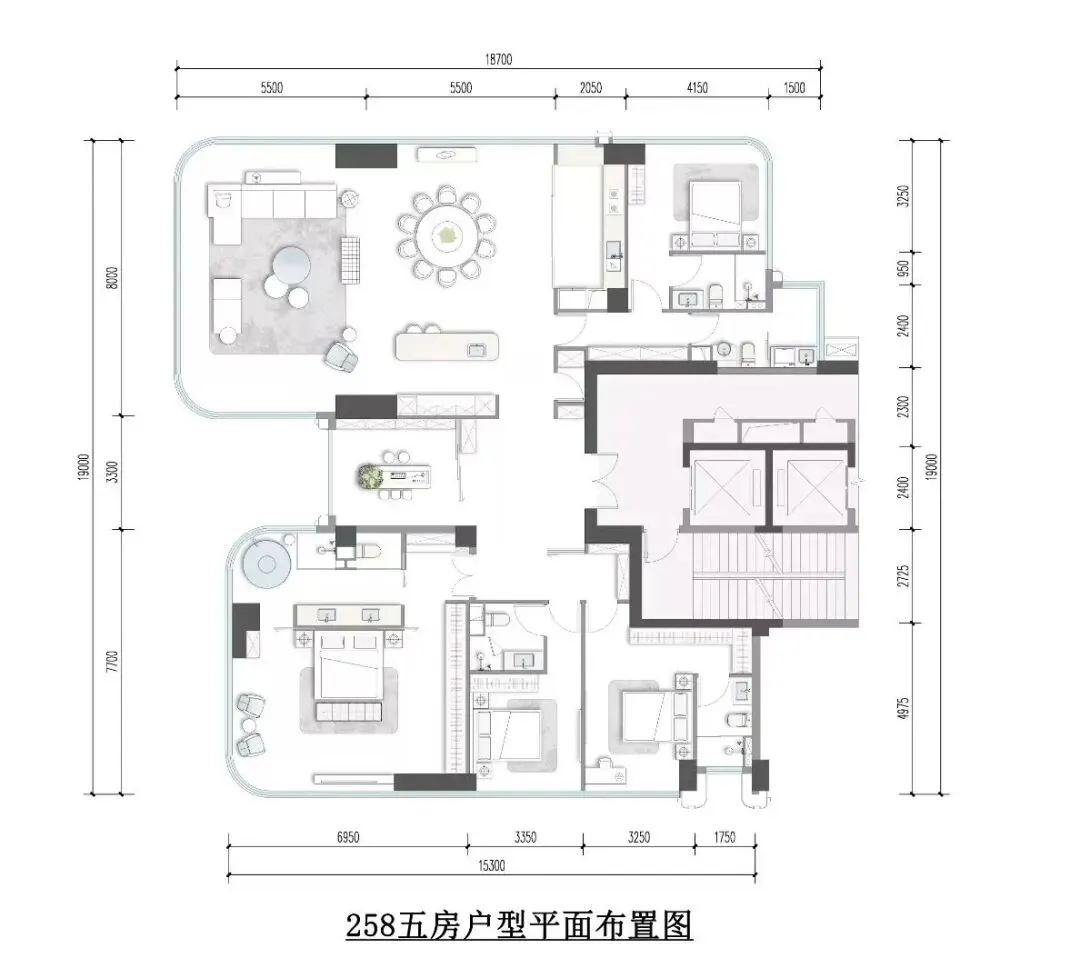 一线临江的双U全景舱,一共两种户型,258㎡的五房大平层,和200㎡的四房三卫大平层。