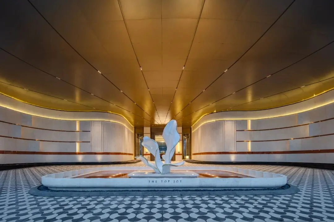 再往里走,是地下车库,门前就是中央车站,这也是许多一线城市高端产品的手法,更重要的还是审美,大量的石材,全空间吊顶,上方还有一抹天窗,流动着园林的水景。