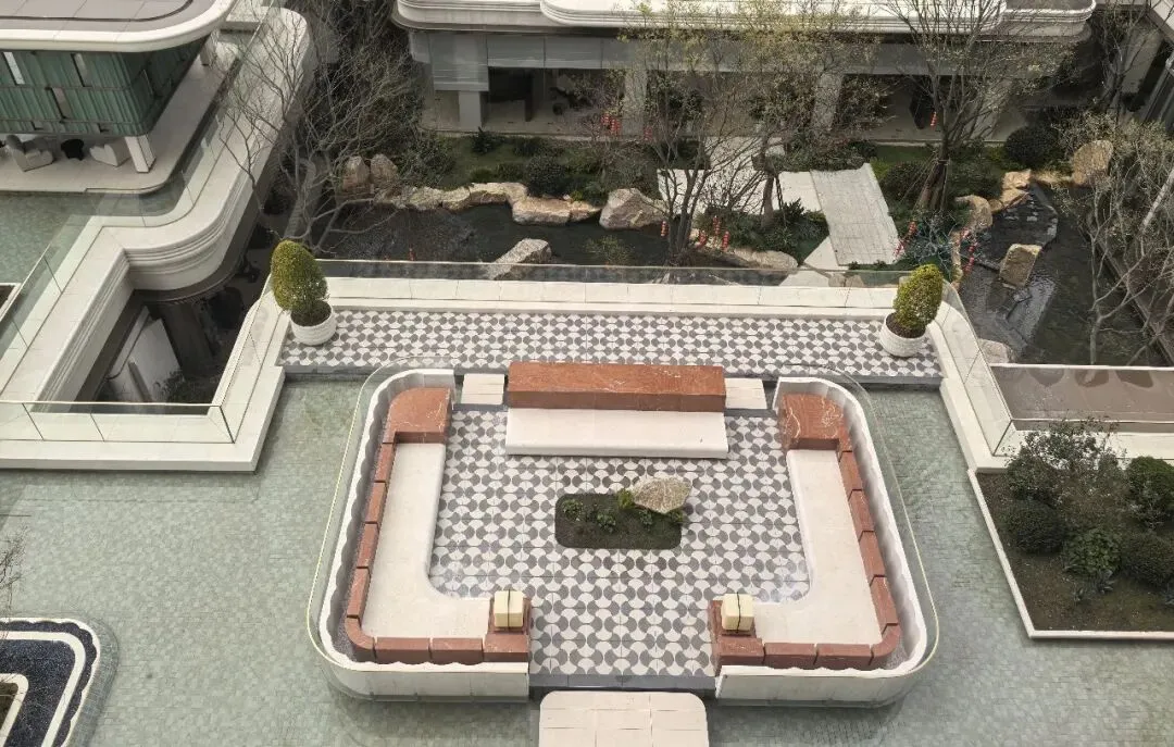下沉式庭院内,采用大量美拉德色系石材,给人温暖厚重的感觉。