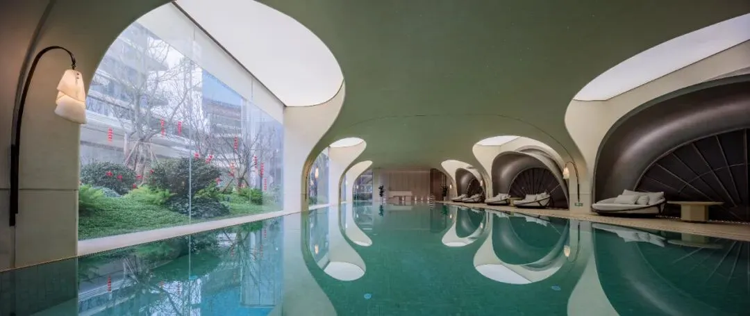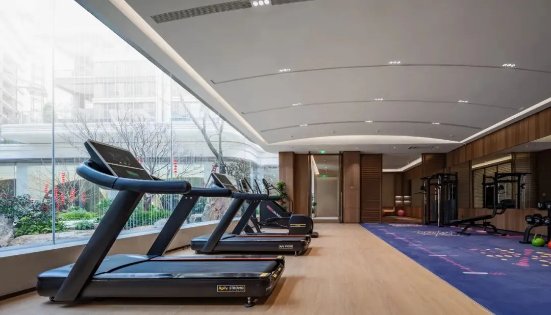 配备了健身房、泳池、会所。从健身房看出去,巨幅落地窗外,是下沉庭院的立体园林,再往里走就是泳池,非常有科技感。