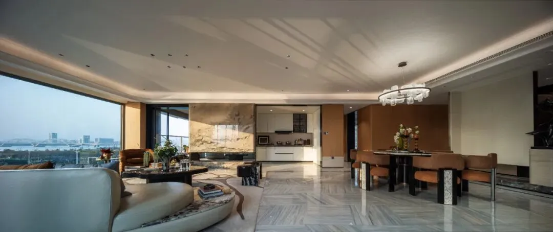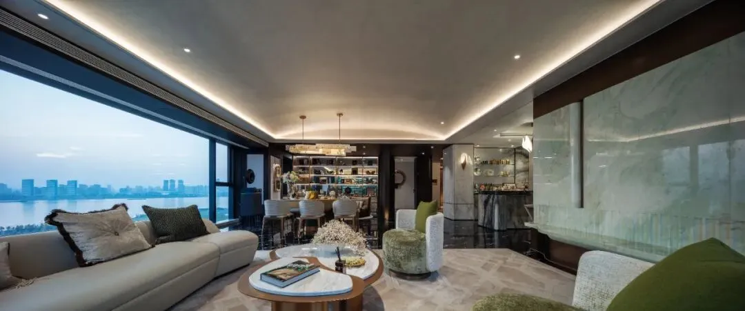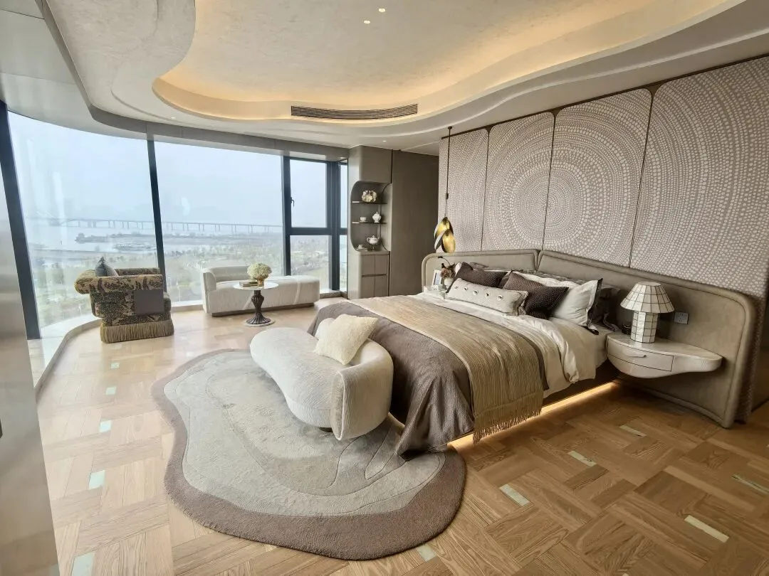 客厅和主卧都拥有环绕的江景视野,270°无遮挡,两个空间像悬浮于江面上。