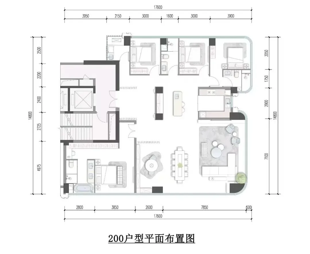 200㎡的户型,也是双U设计,85㎡的客餐厅,江景主卧大套房。
