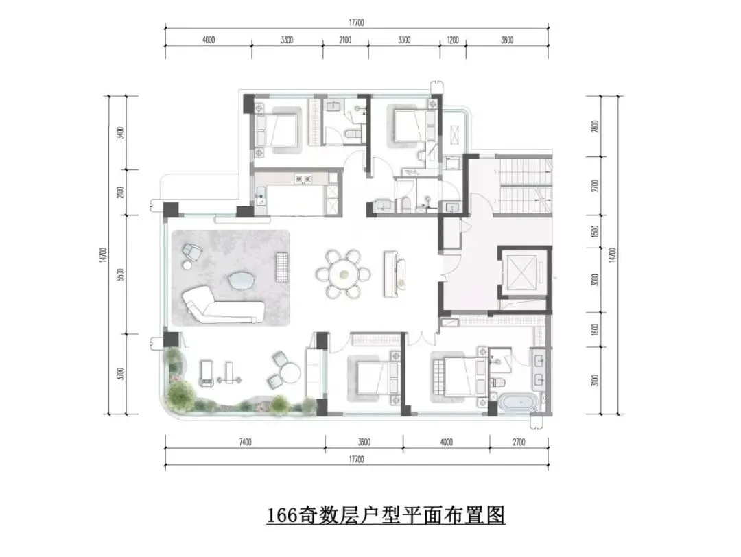 其实抛开露台,这个户型本身可以算作一个端厅户型,客厅西面采用落地窗设计,采光和景观效果都很好,完全区别于普通第四代住宅。