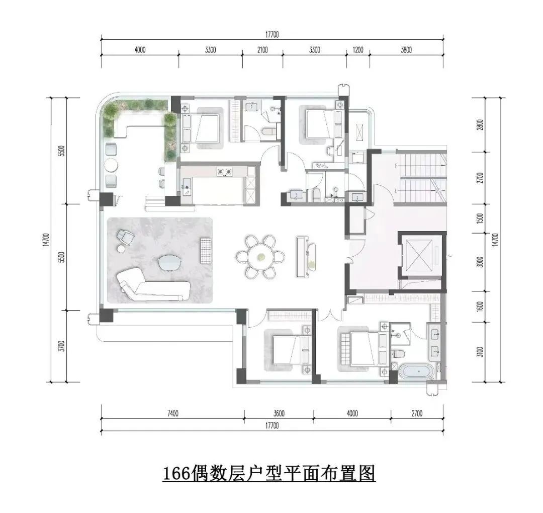 166㎡四房三卫的户型,LDKG一体化设计,面积能达到约97㎡,采用双套房设计。