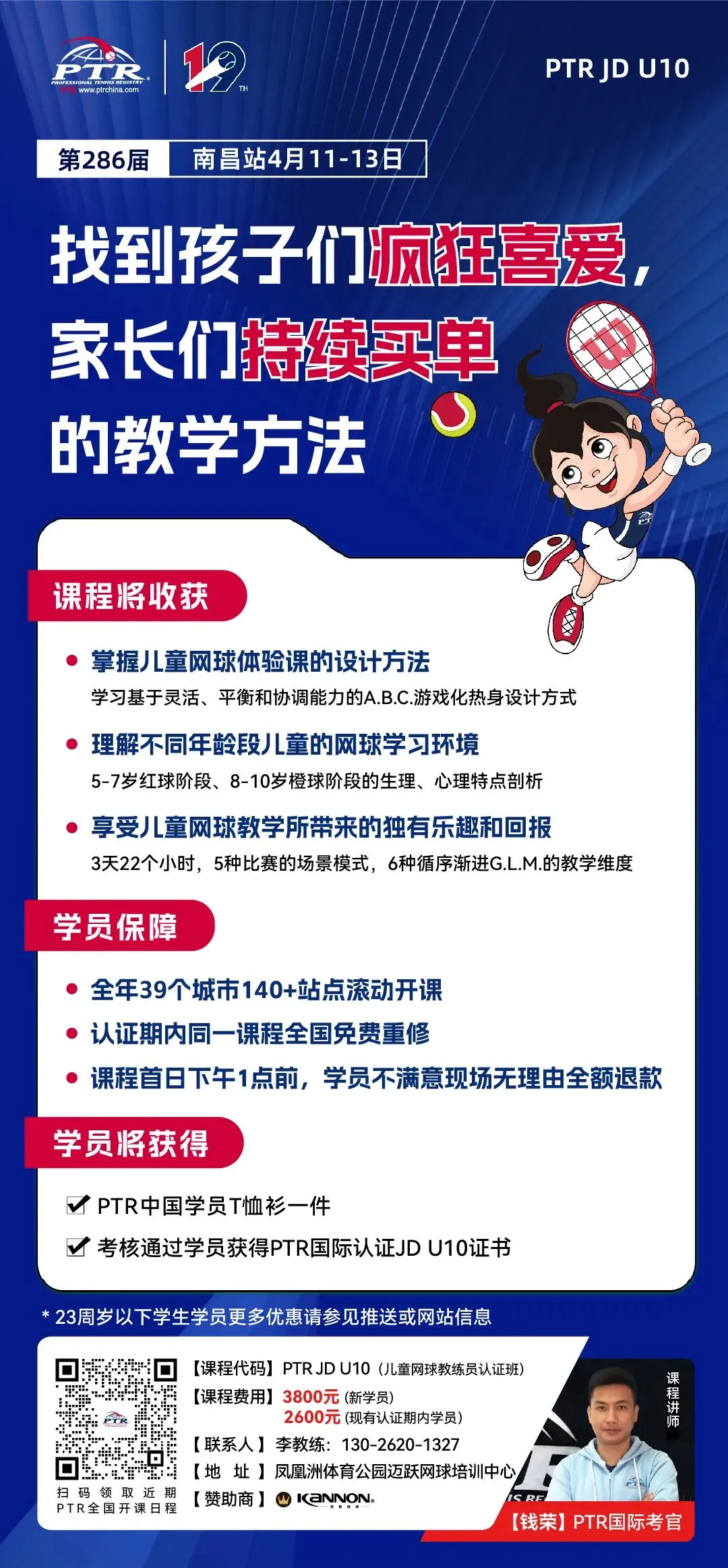 2026年4月11日-4月13日,【PTR中国】将与【迈跃网球】合作,将 PTR JD U10课程带到南昌,在三天时间内为南昌地区的广大网球教练员带来一场“找到孩子们疯狂喜爱,家长们持续买单”的网球课程。期待大家的加入!